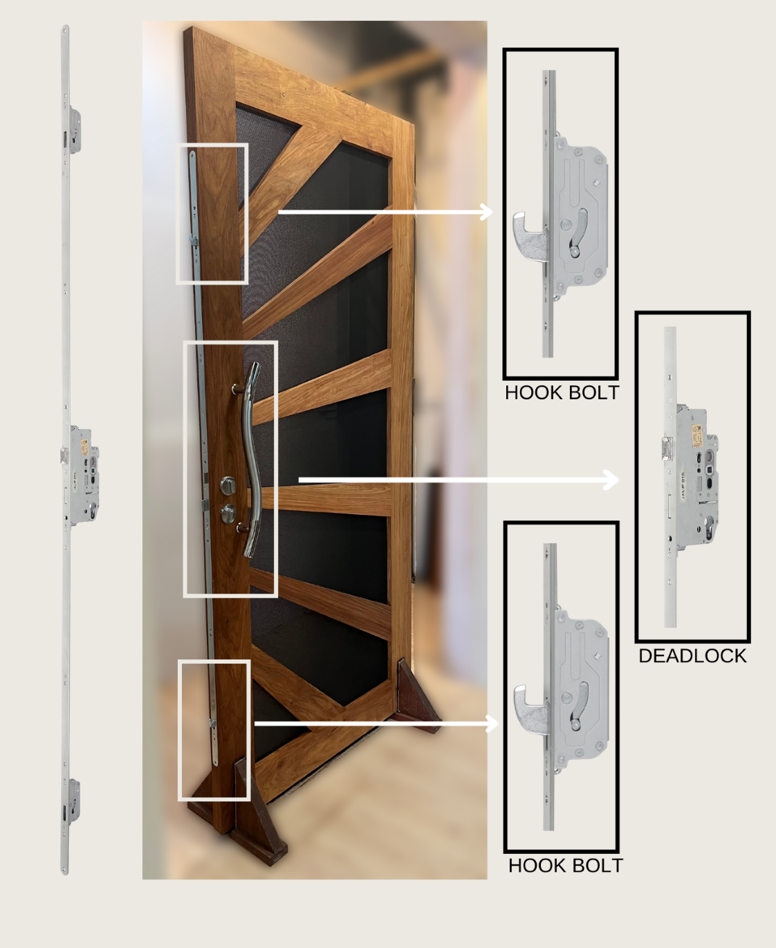 The Three Point Lock upgrade offers a significantly improved level of strength and security compared with standard mortice deadlocks. The multi-point lock is very easy to operate and works simultaneously combining two extra hook bolts that are situated 700mm above and below the Deadlock.