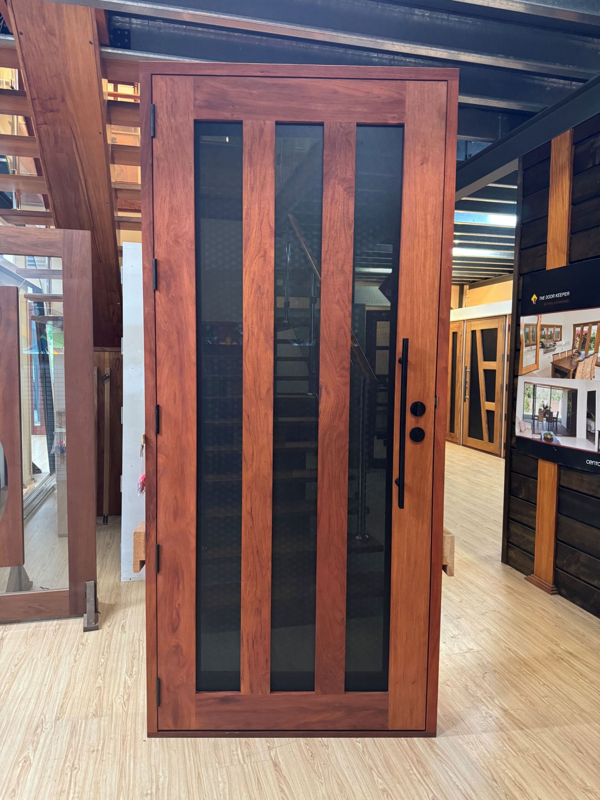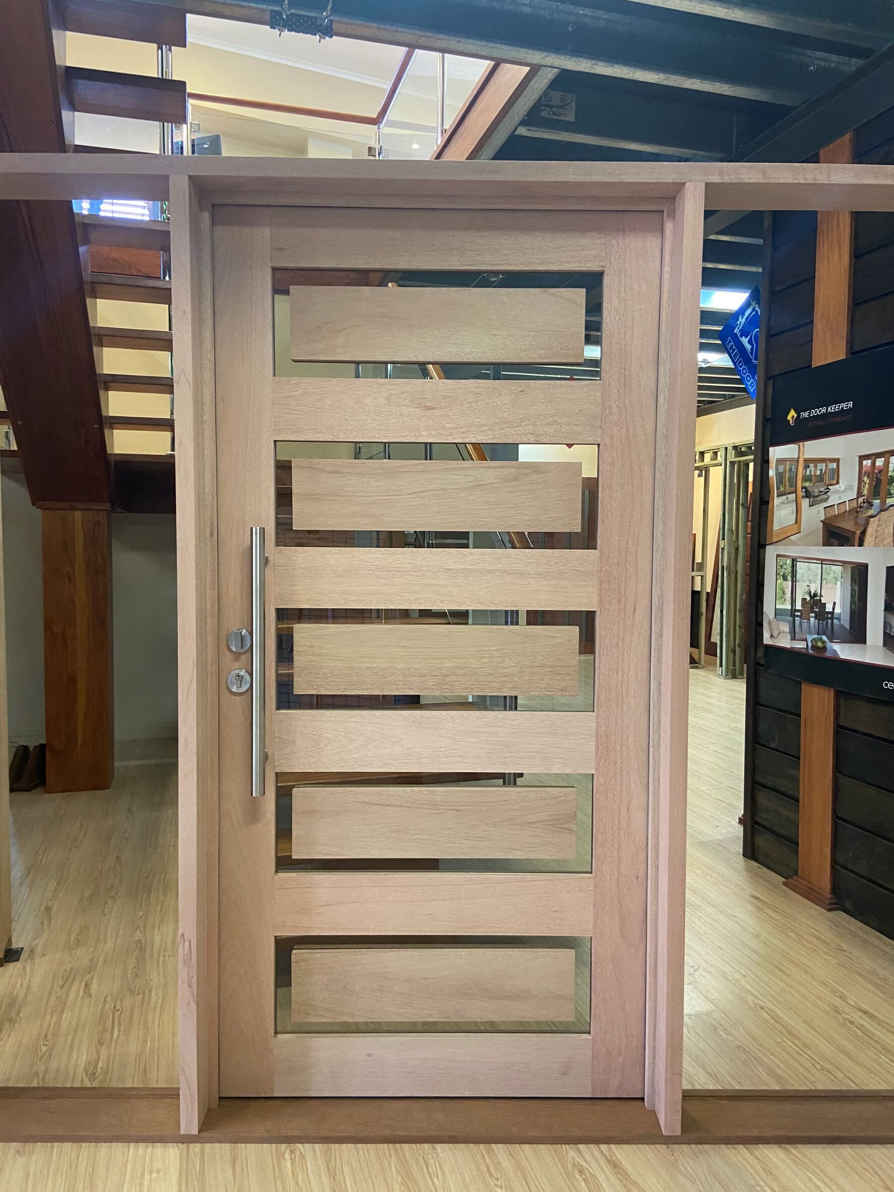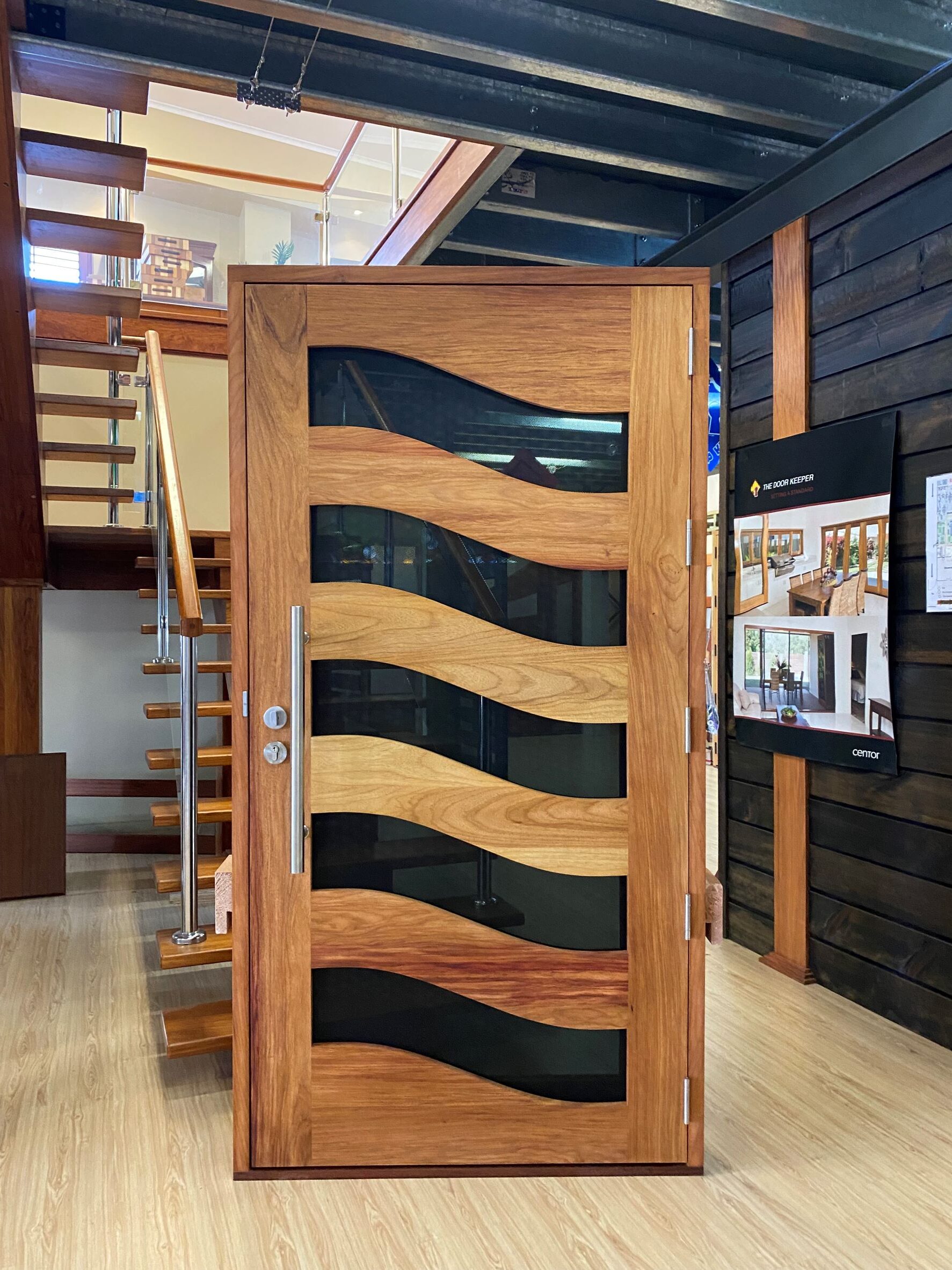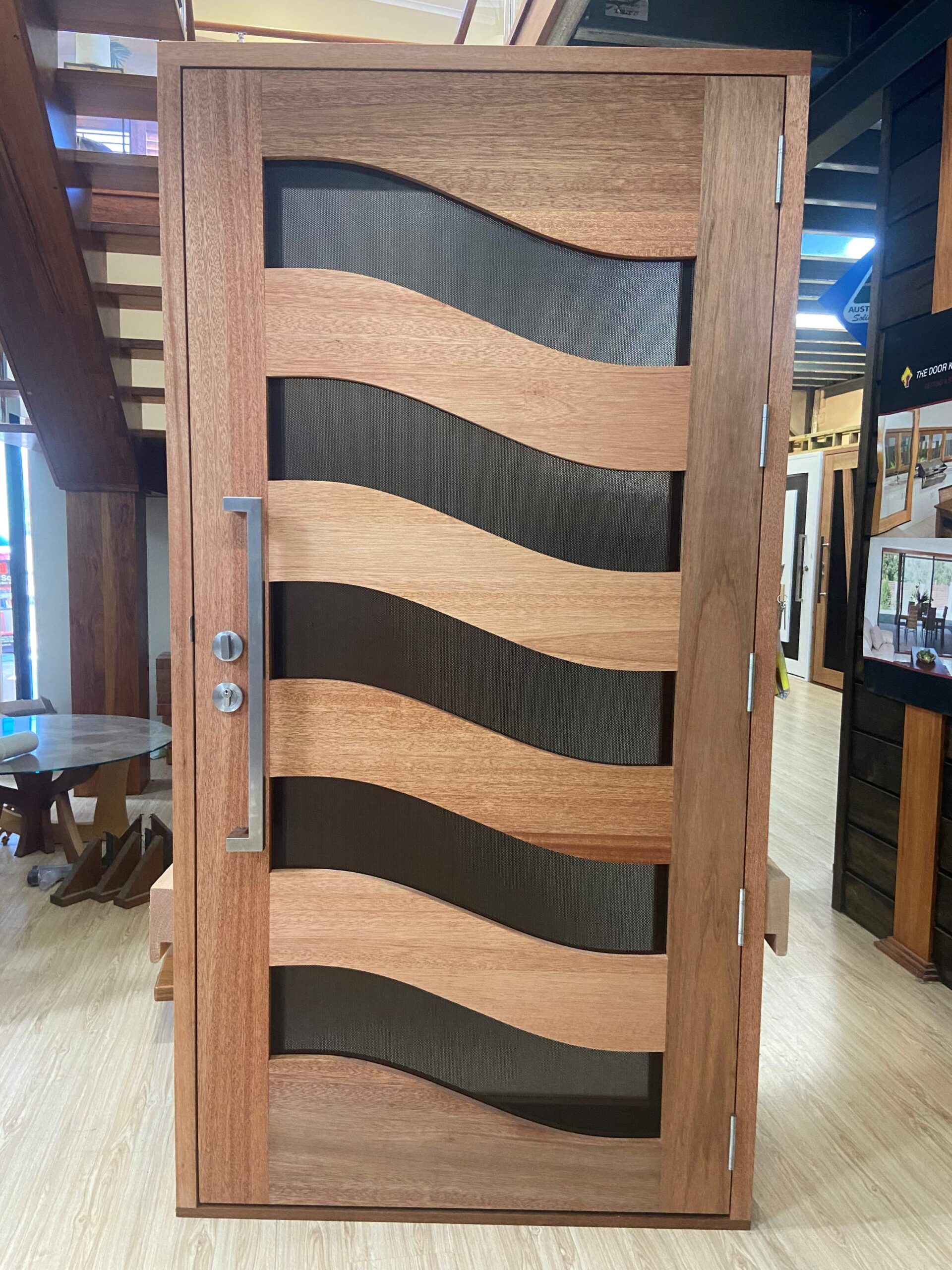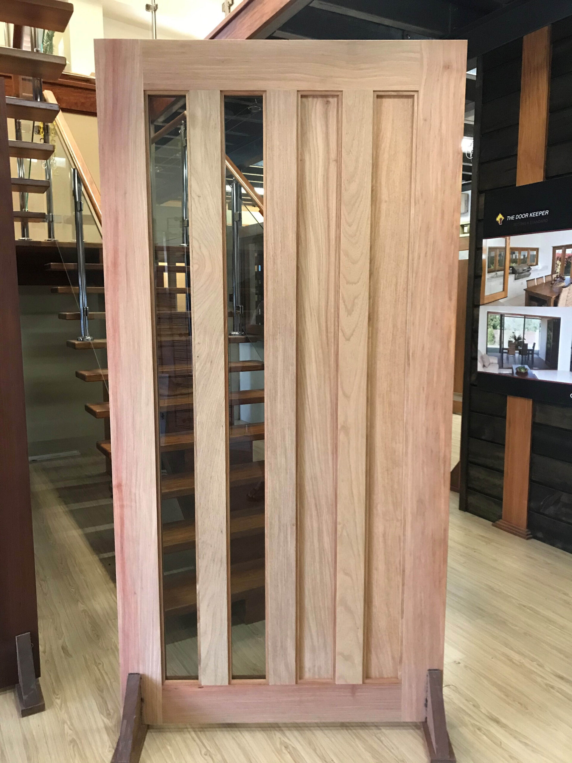 For those who prefer a full timber door, Tirari’s alternating broad and narrow horizontal panels present a contemporary appeal.