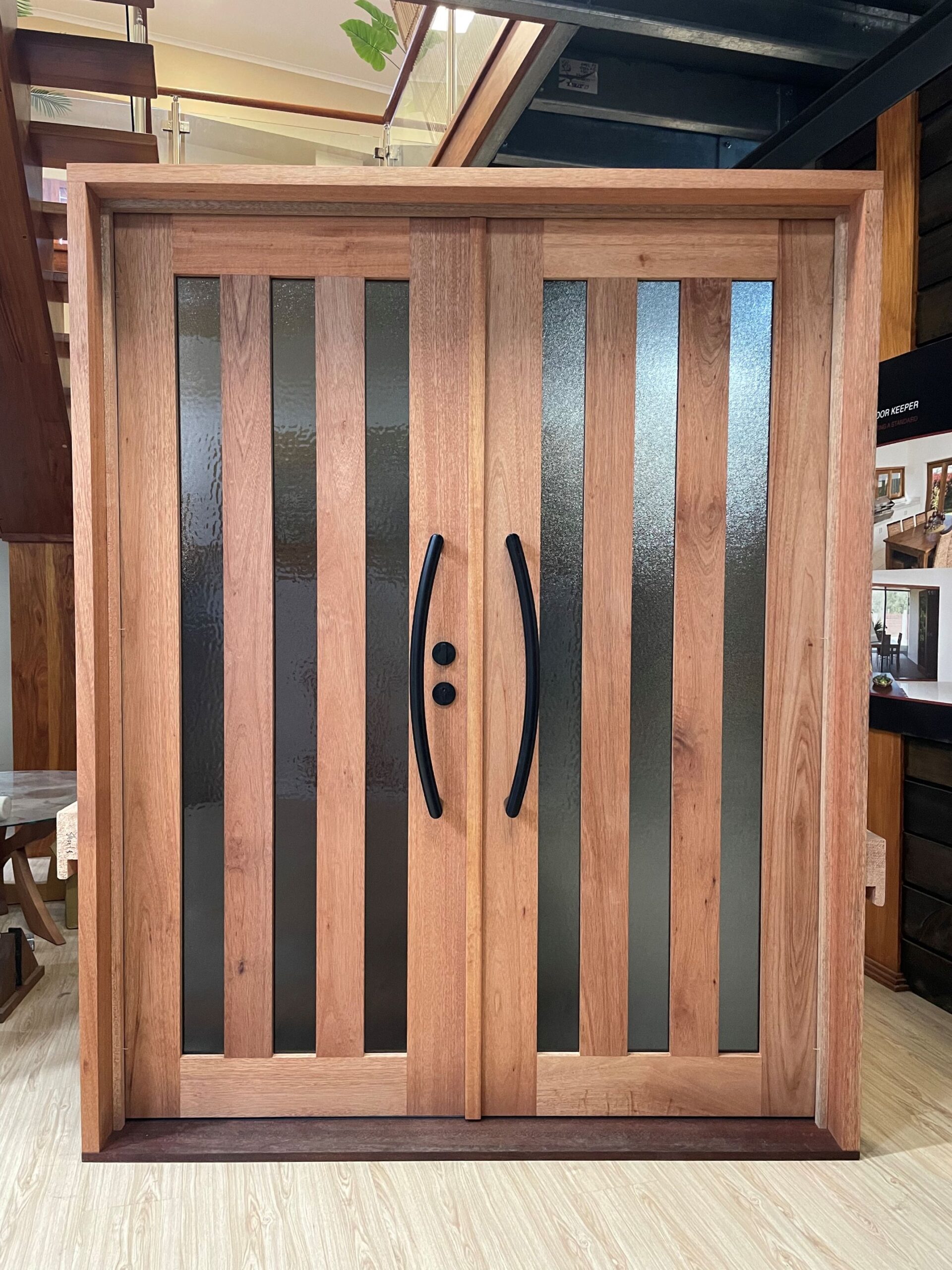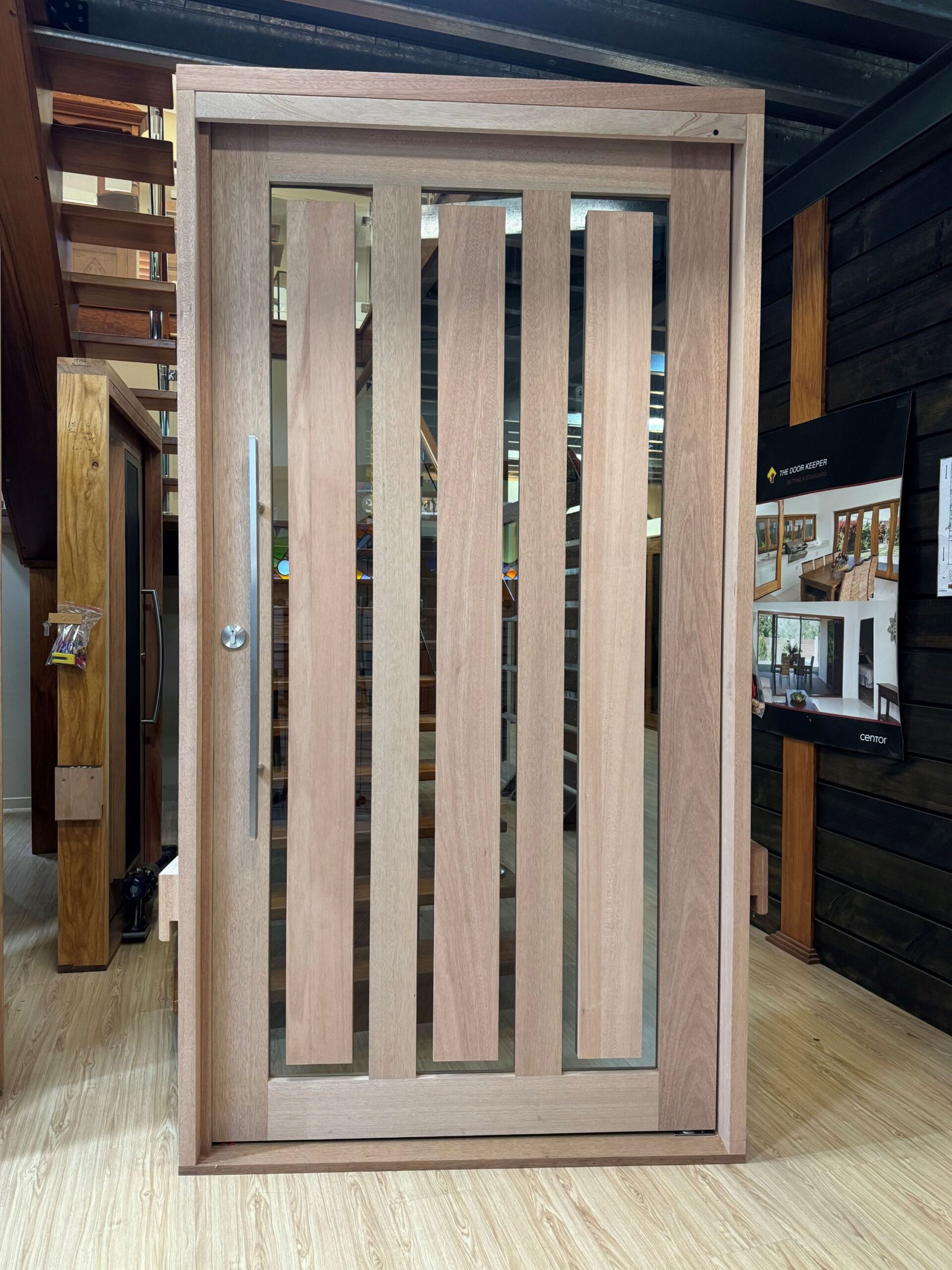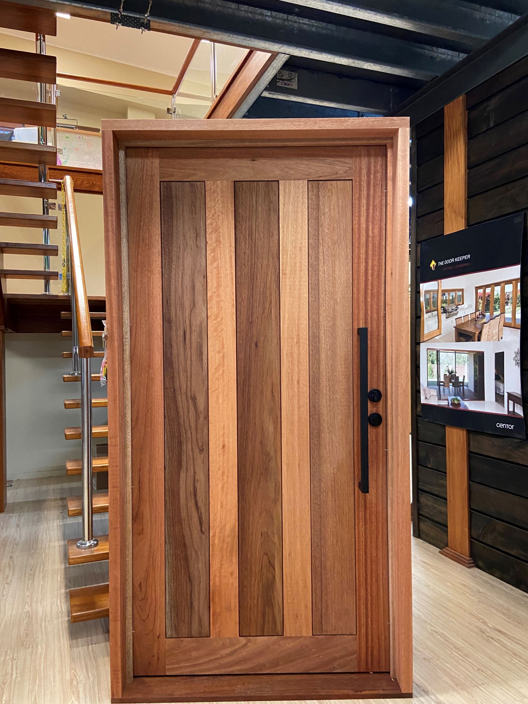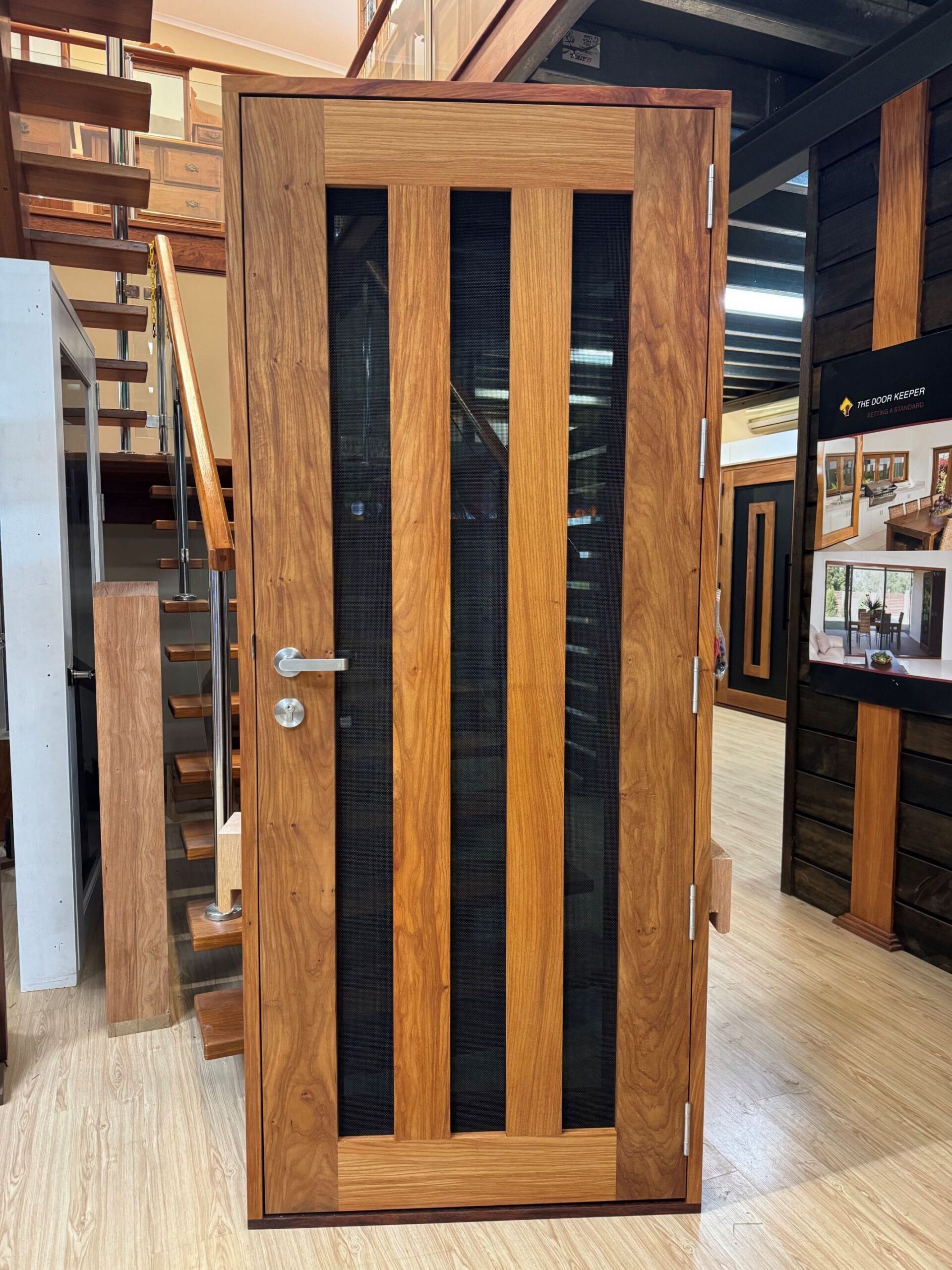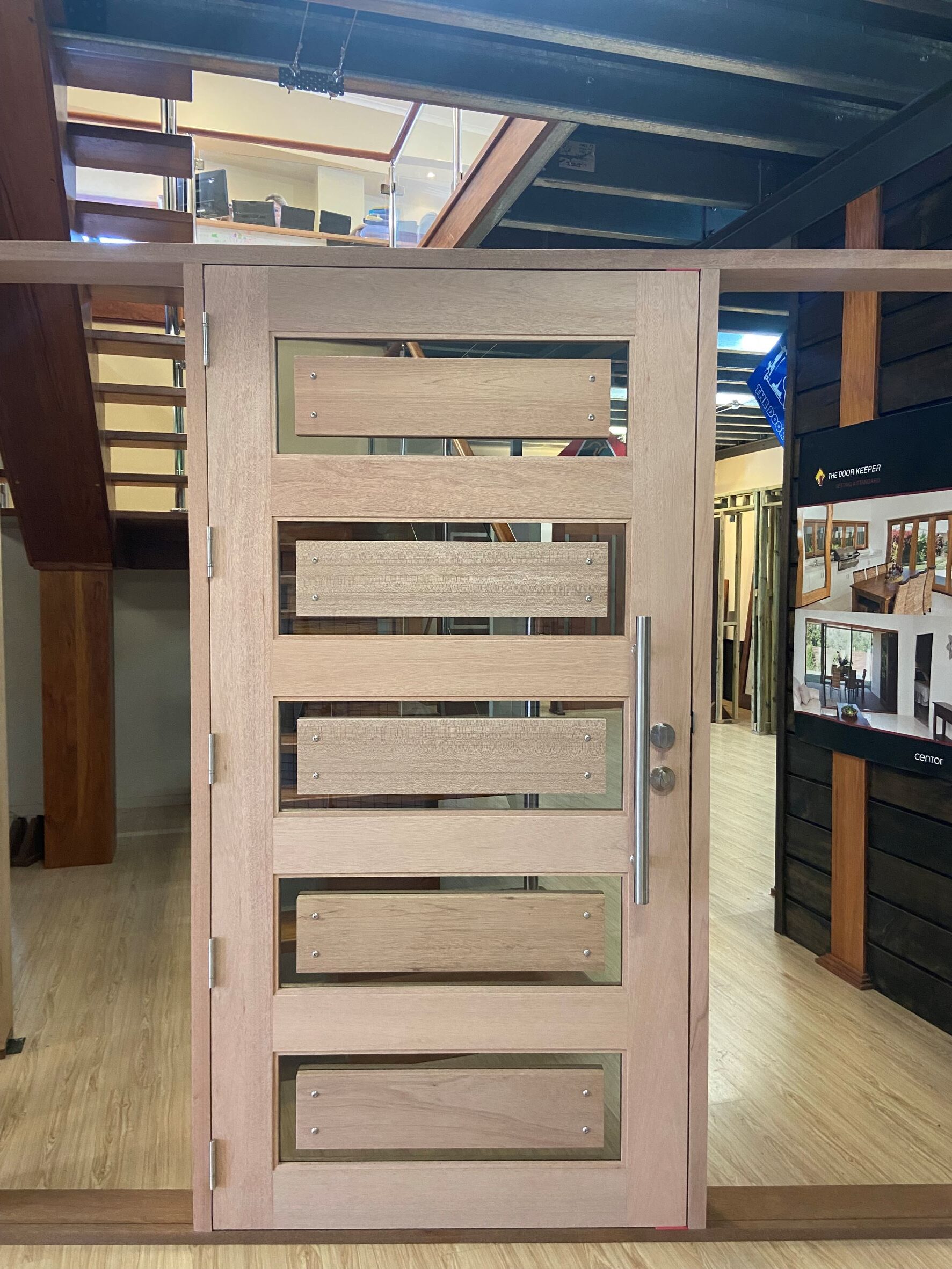 For those who prefer a full timber door, Tirari’s alternating broad and narrow horizontal panels present a contemporary appeal.