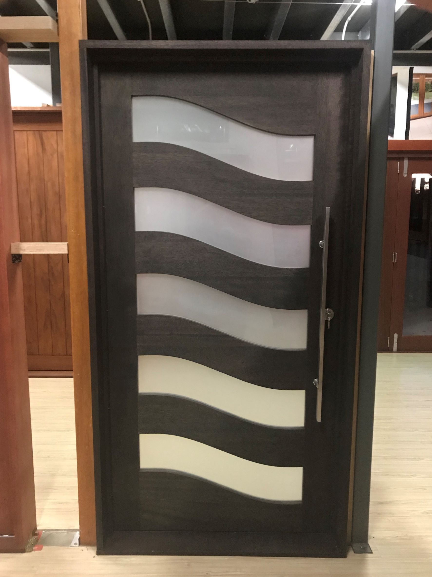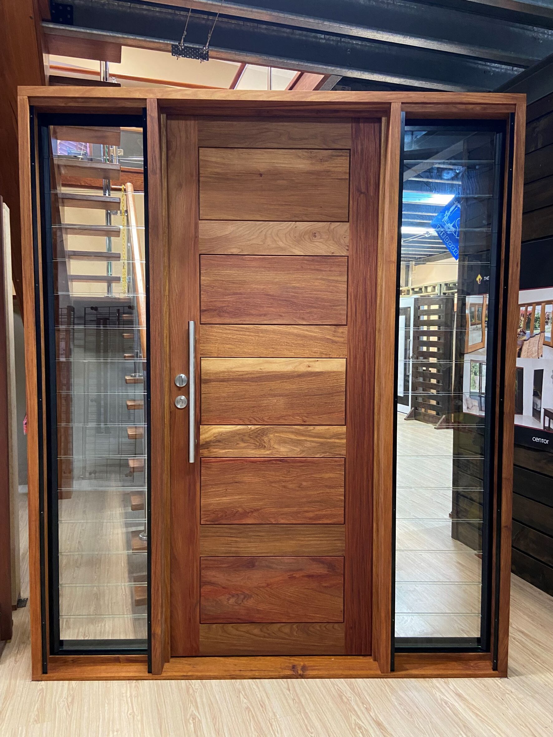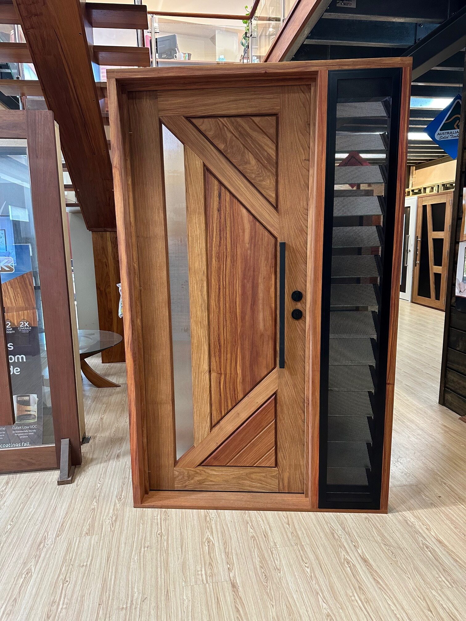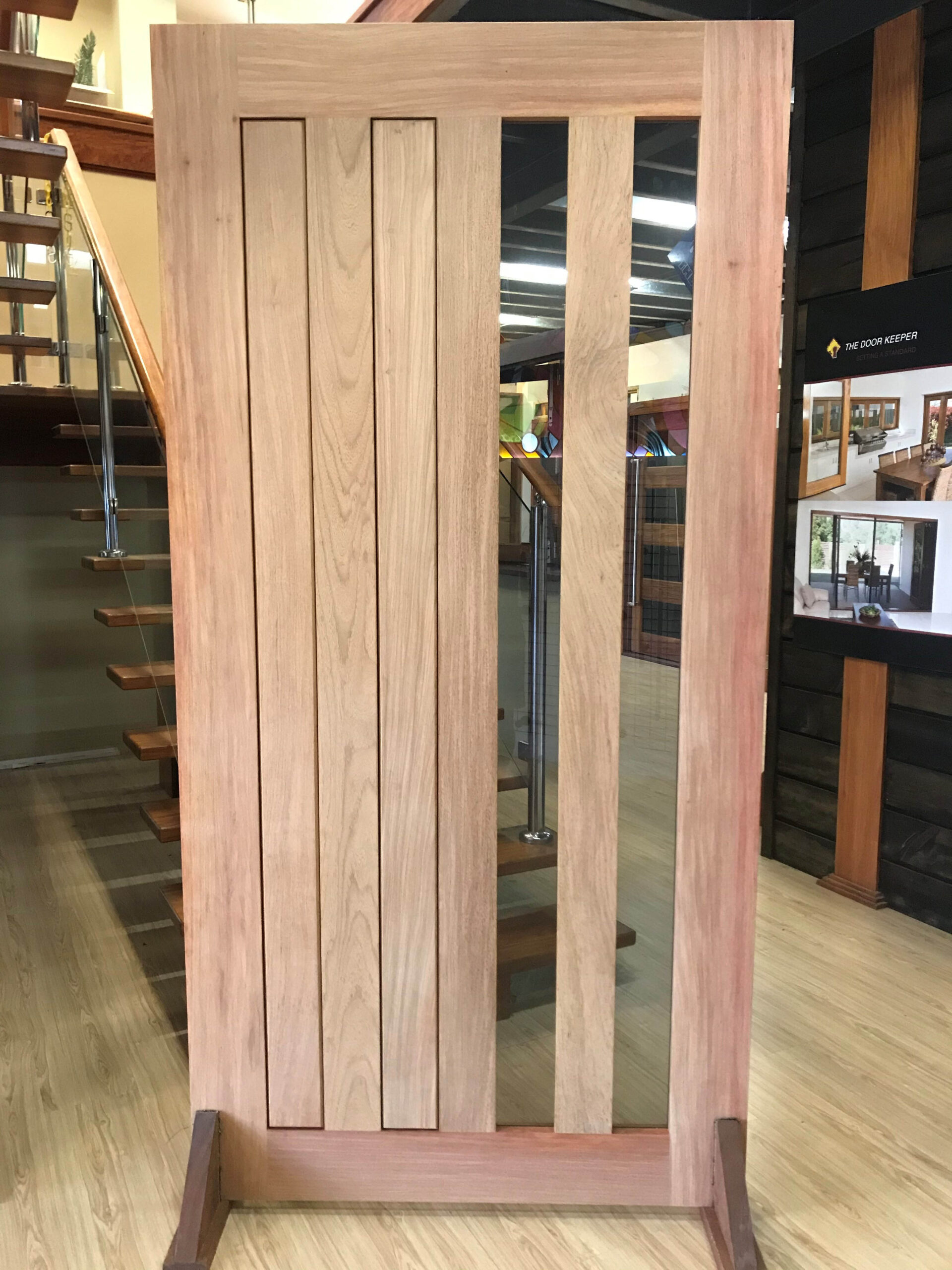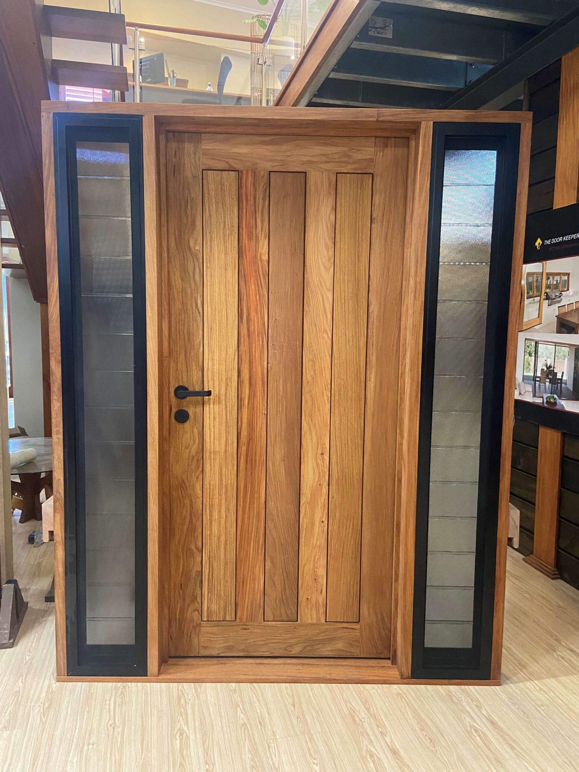 For those who prefer a full timber door, Tirari’s alternating broad and narrow horizontal panels present a contemporary appeal.