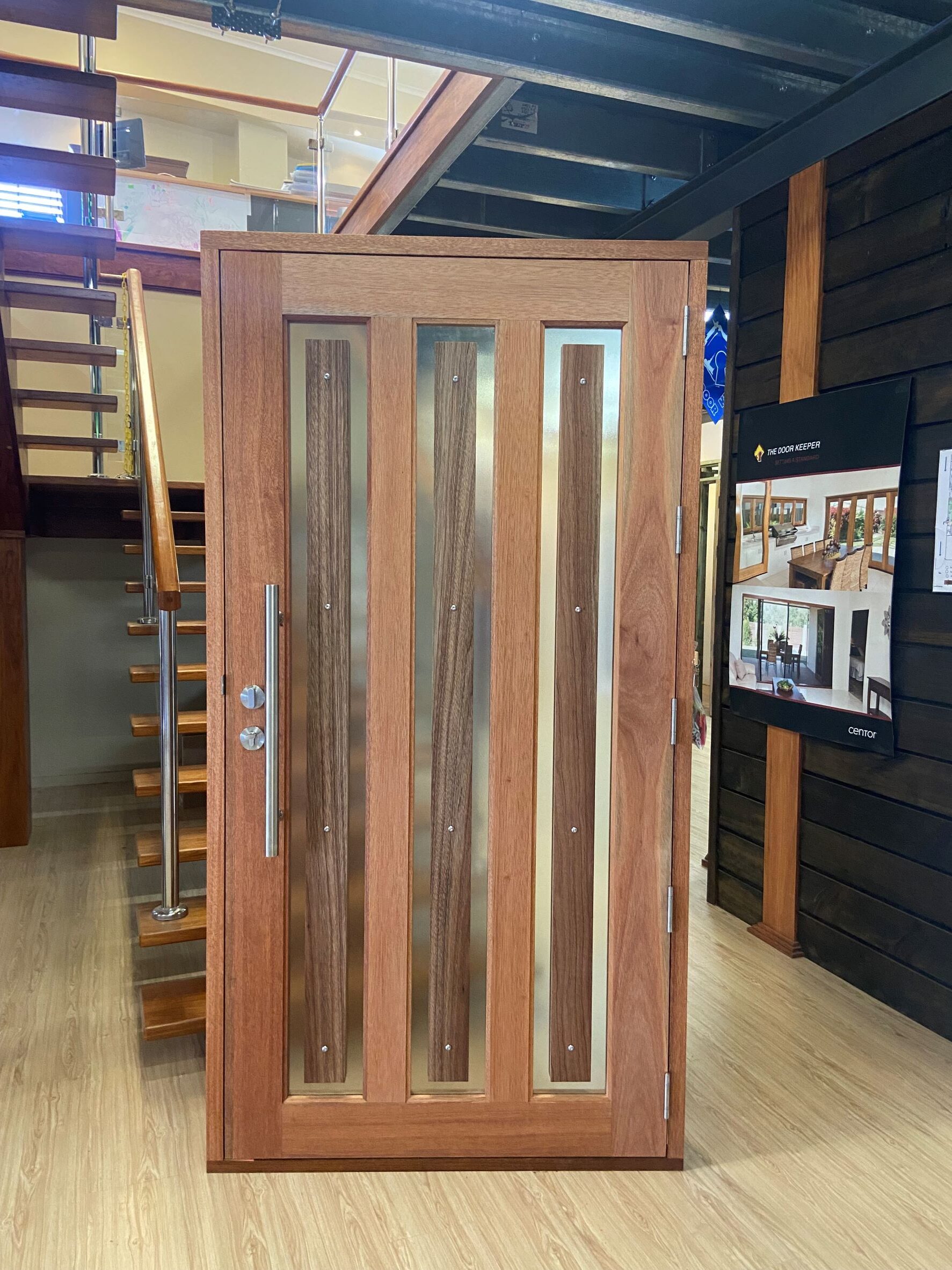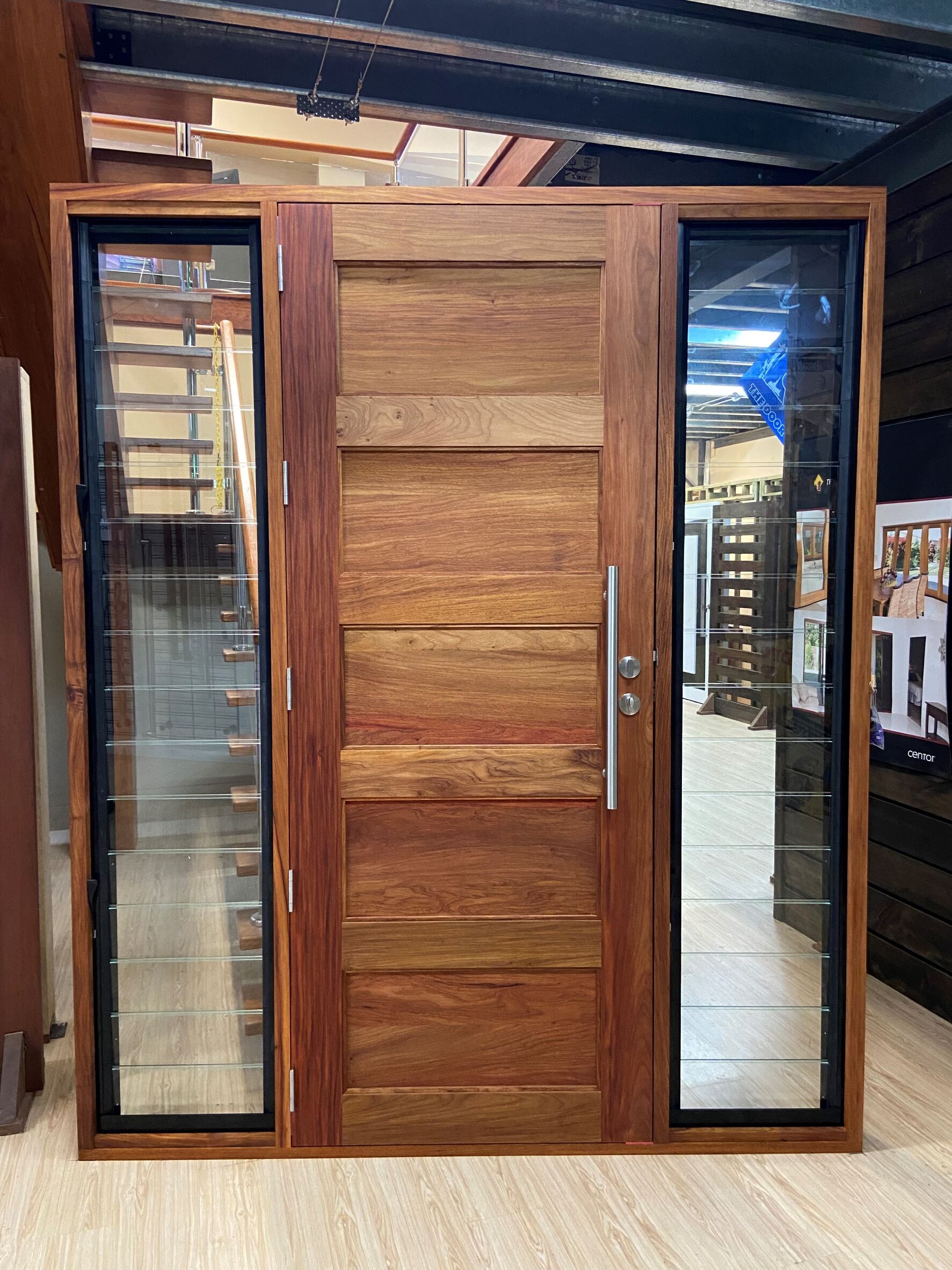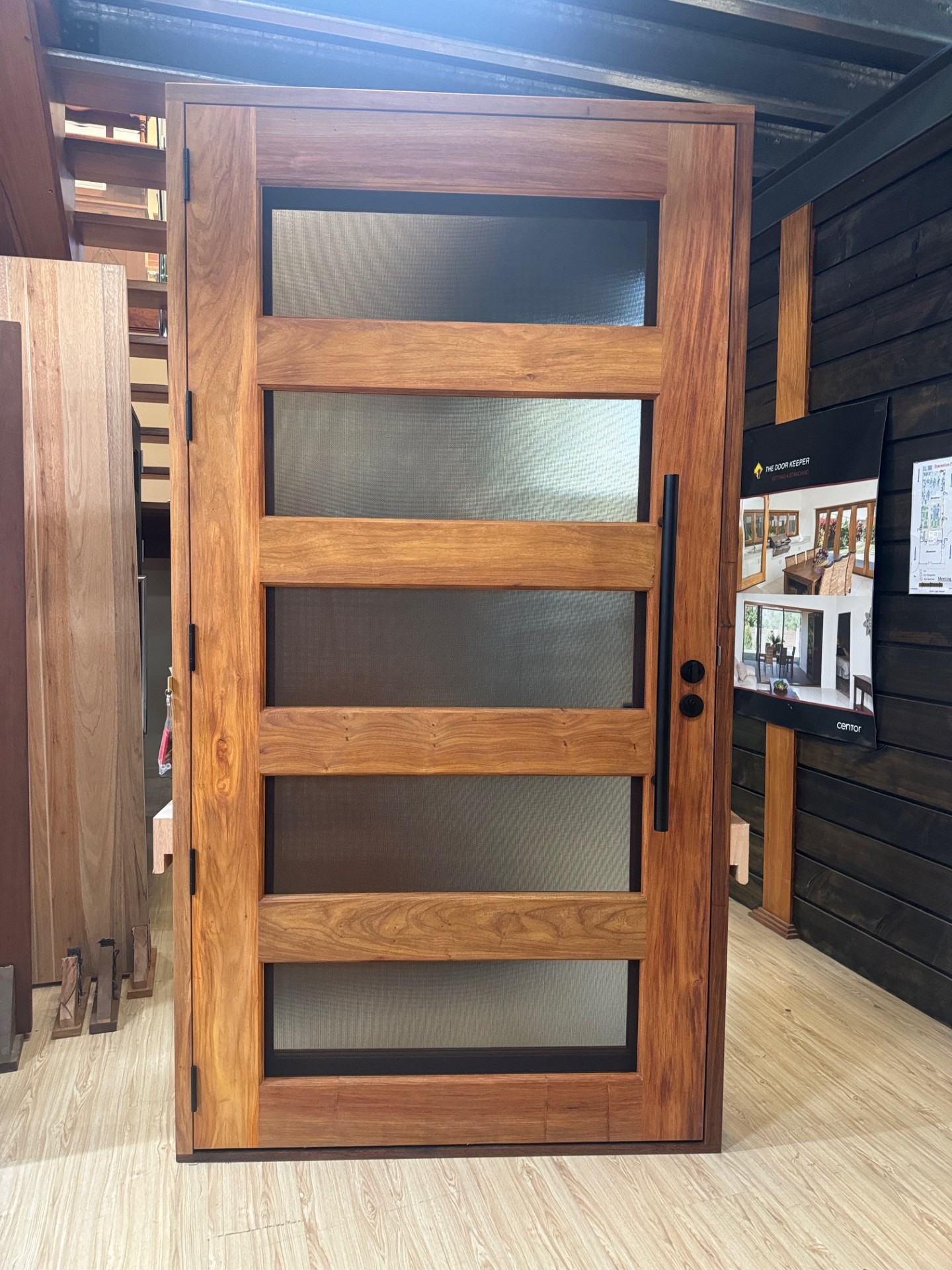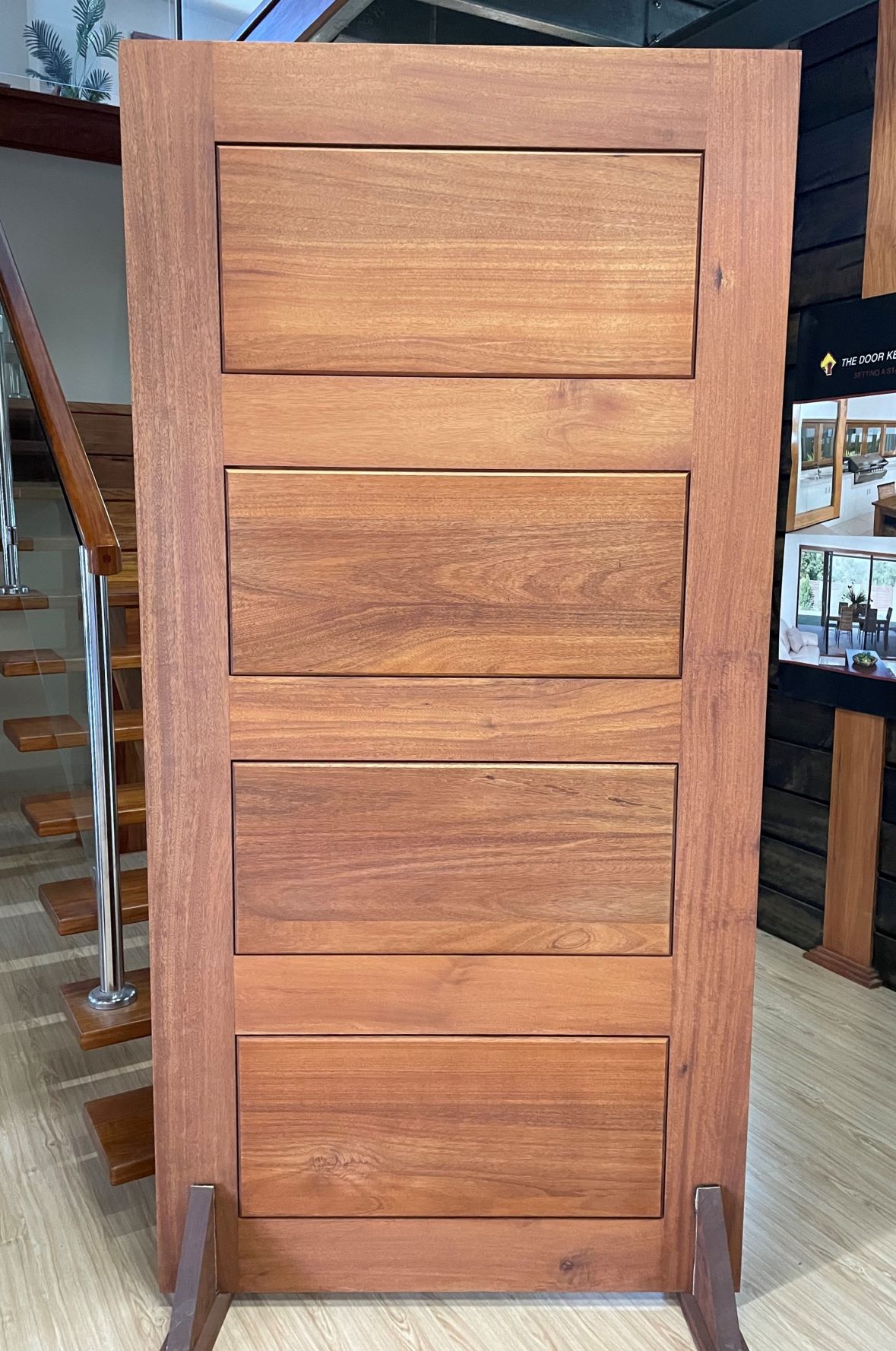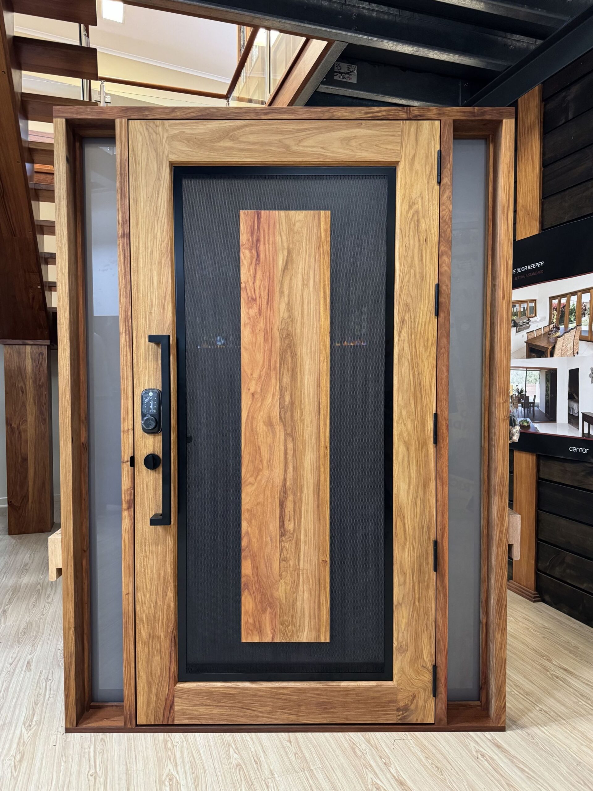 For those who prefer a full timber door, Tirari’s alternating broad and narrow horizontal panels present a contemporary appeal.