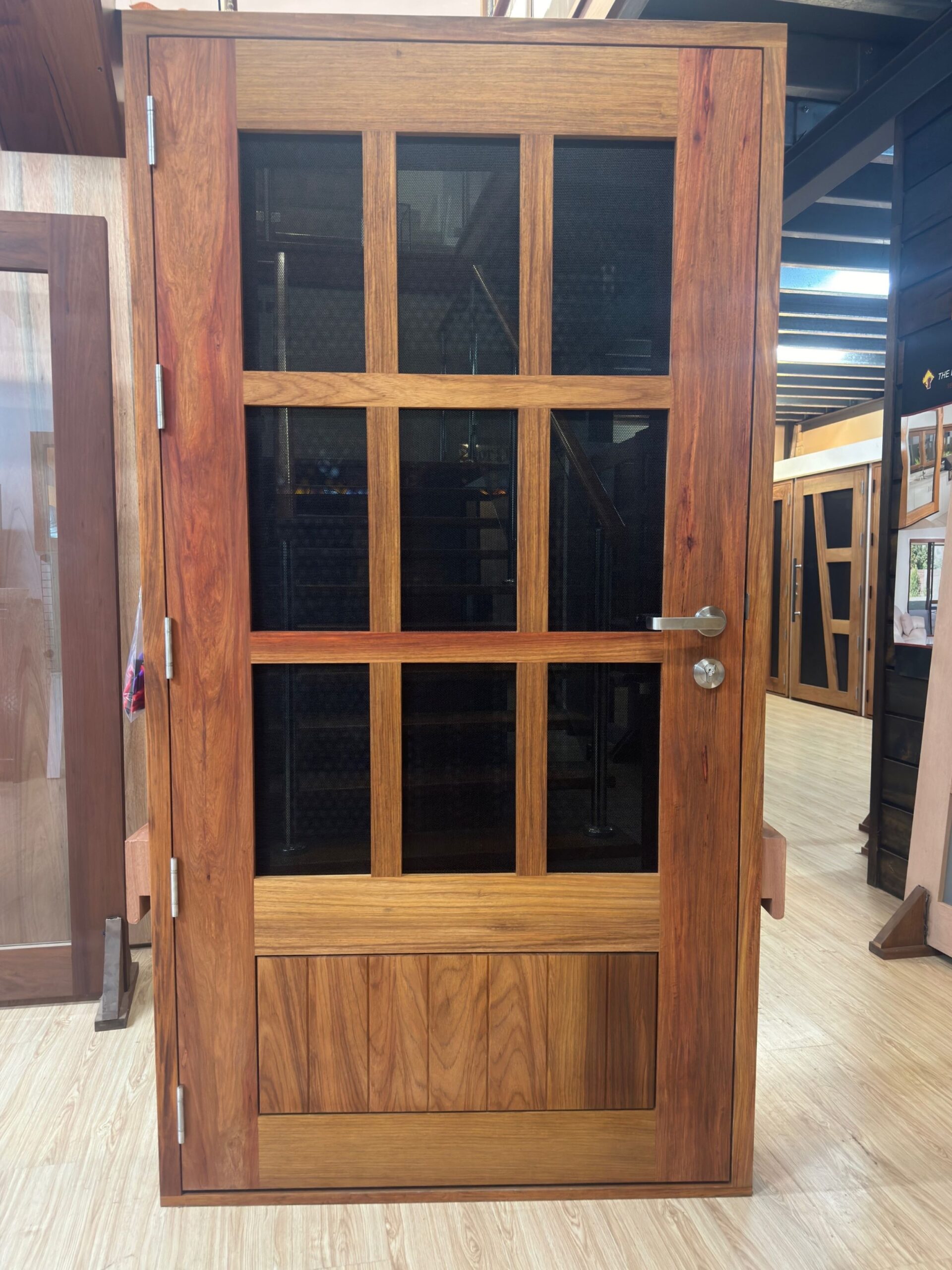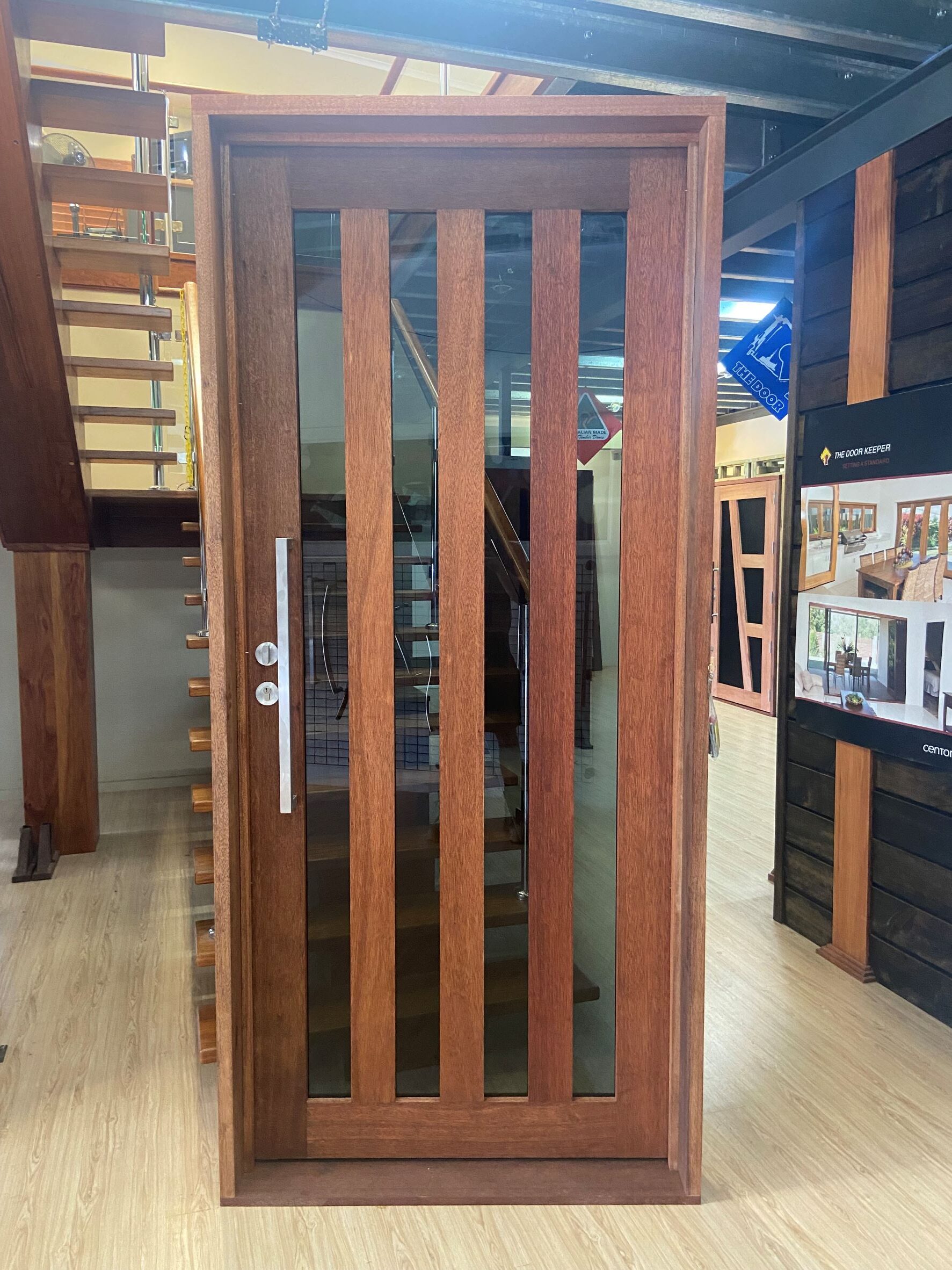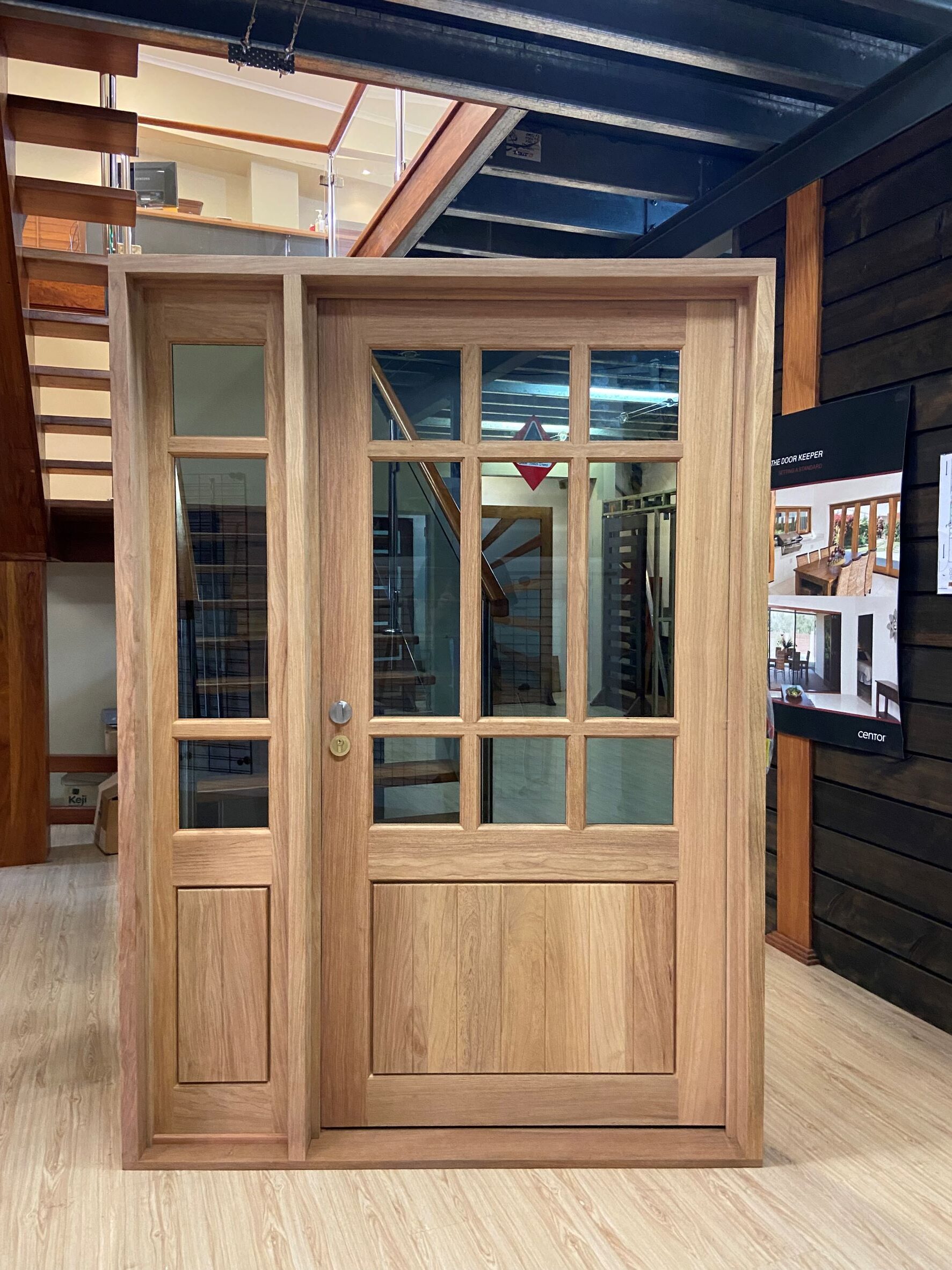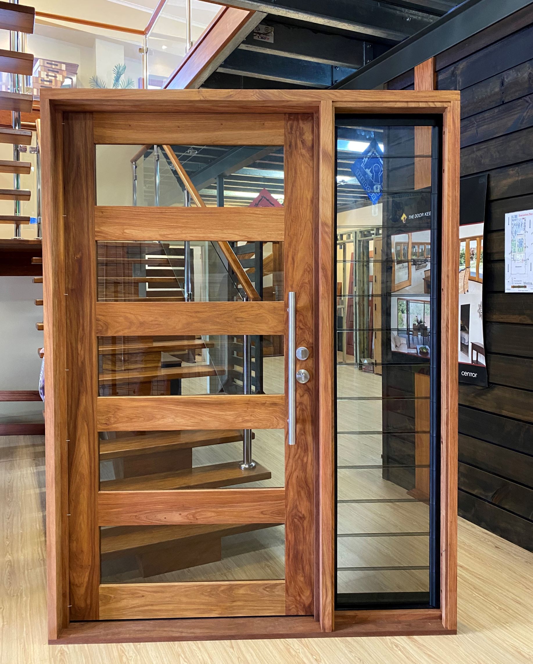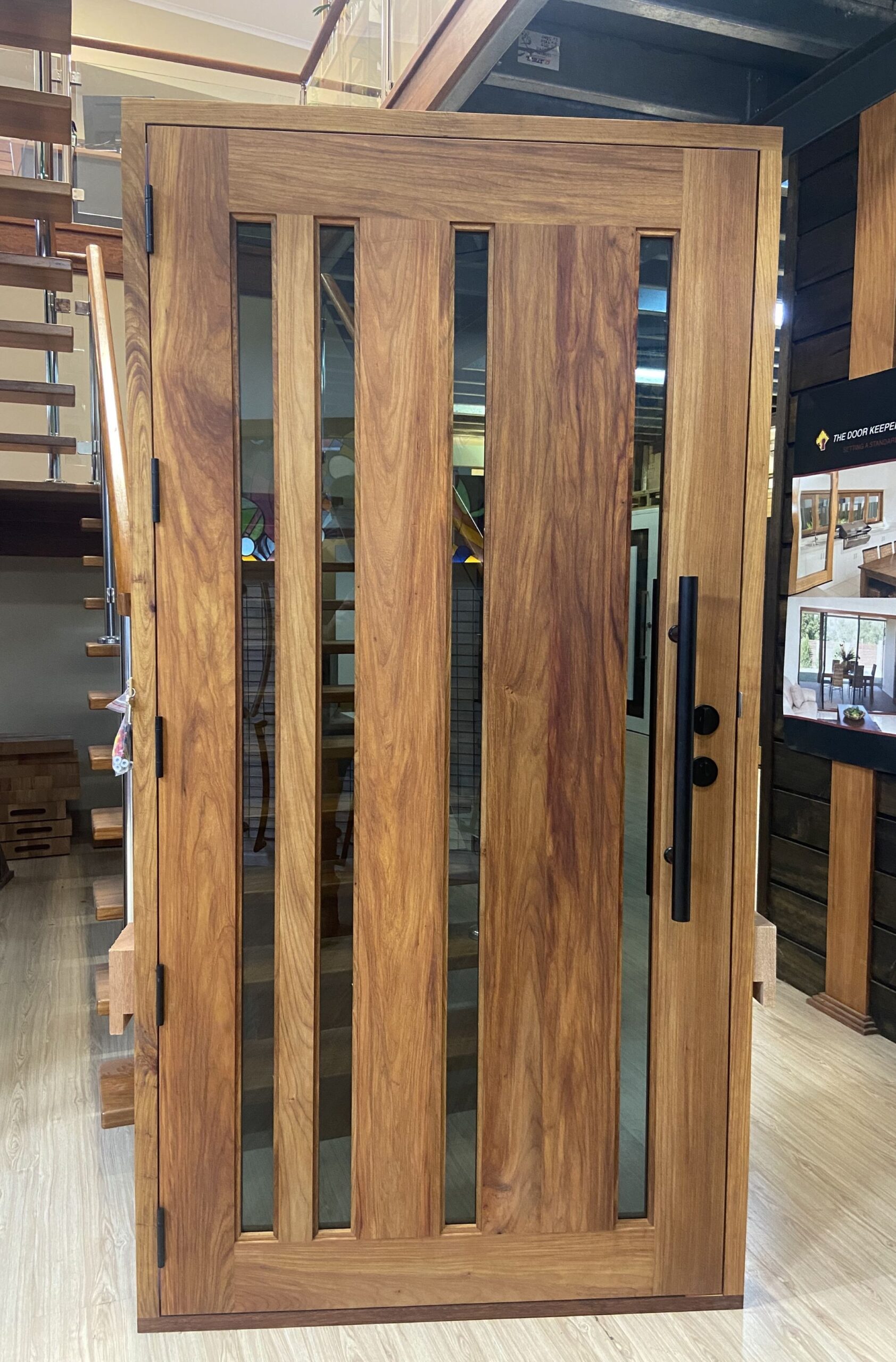 For those who prefer a full timber door, Tirari’s alternating broad and narrow horizontal panels present a contemporary appeal.