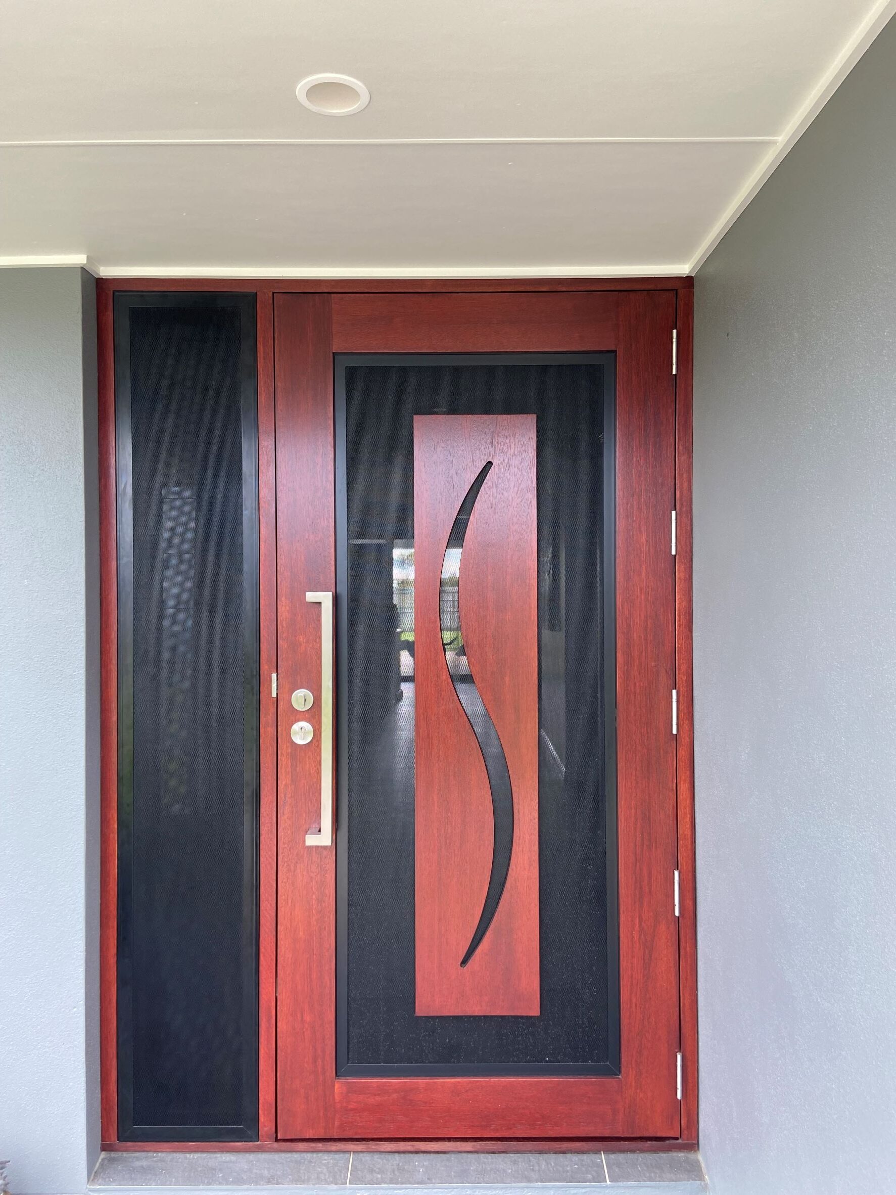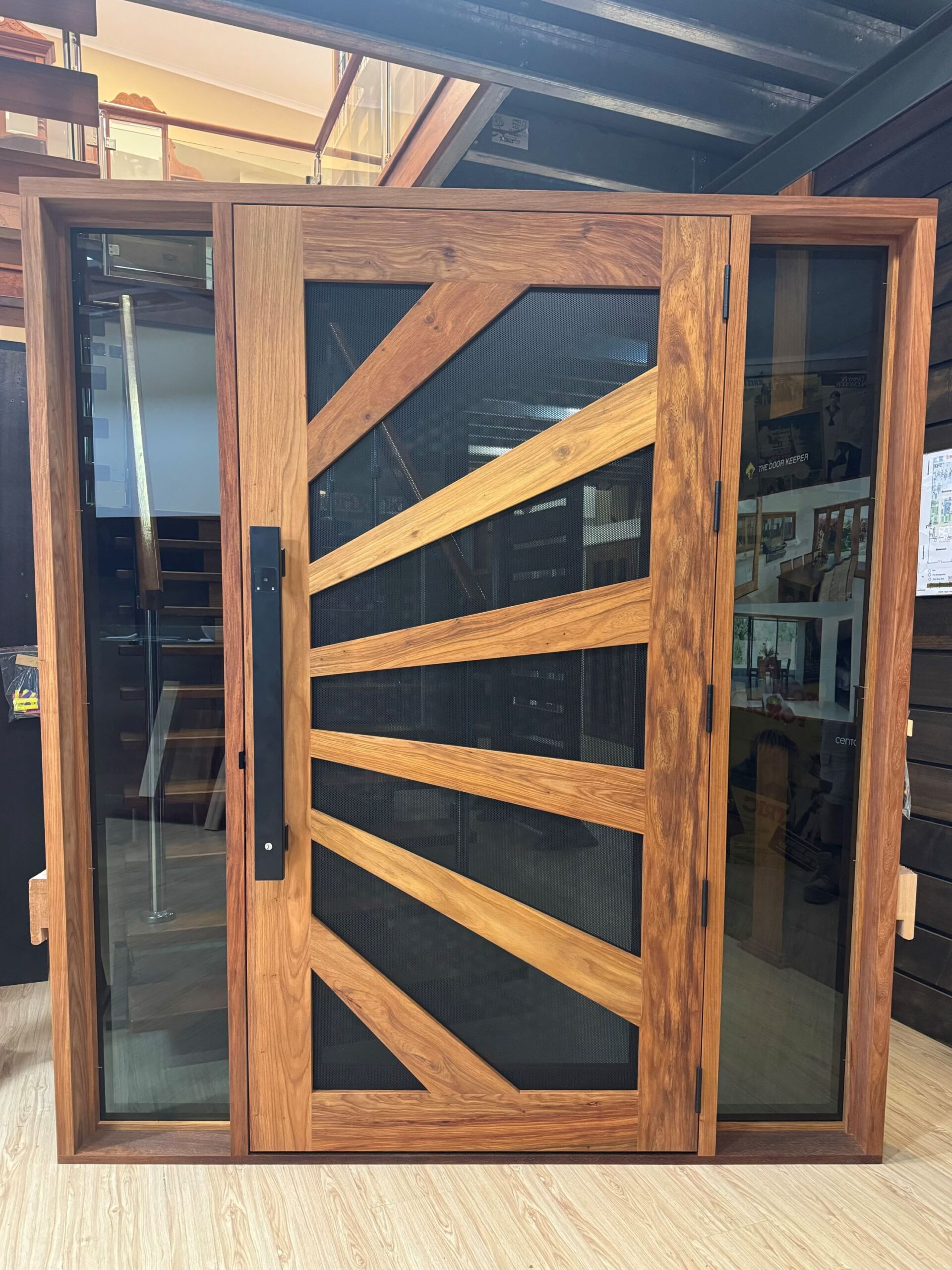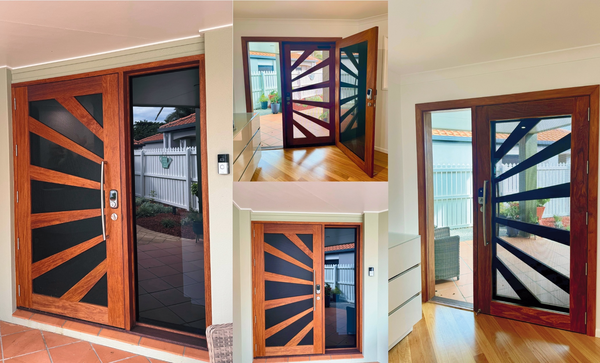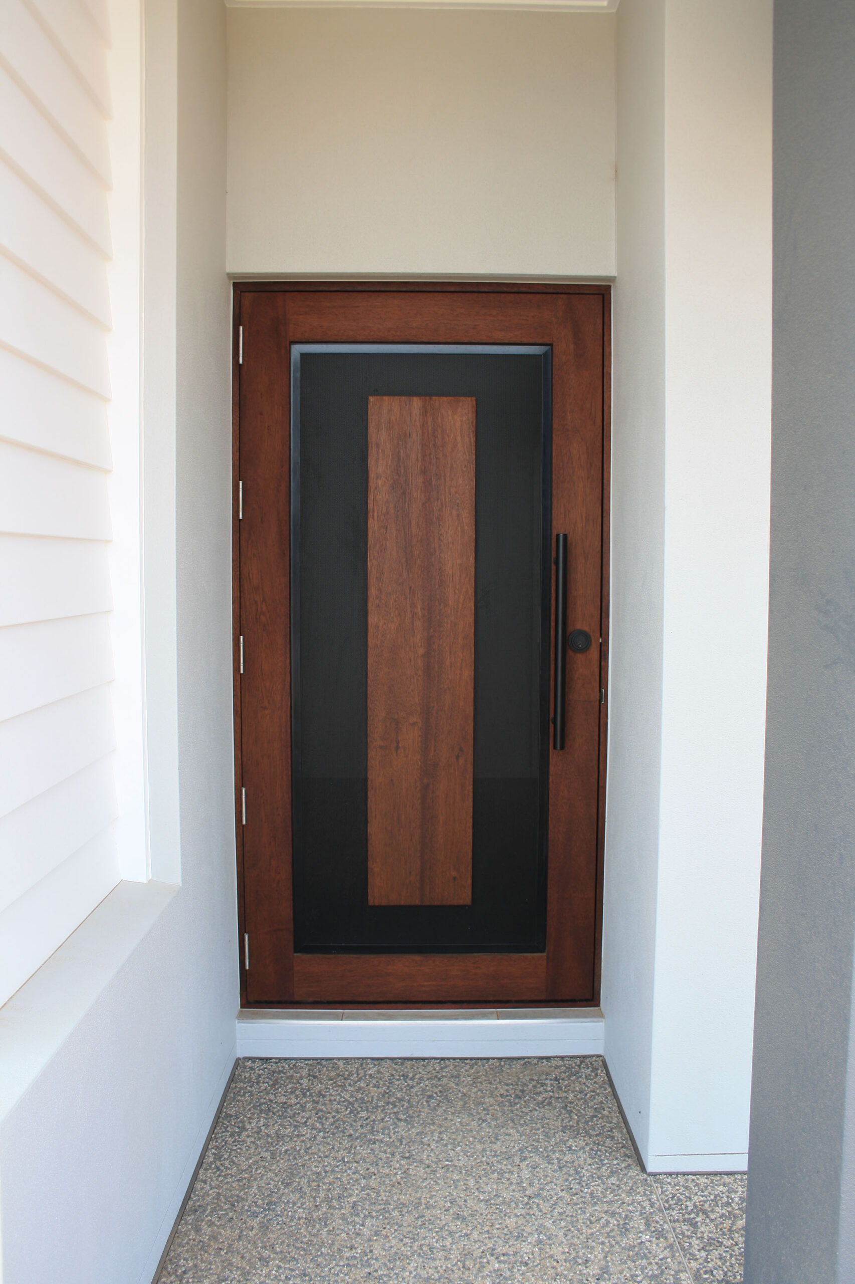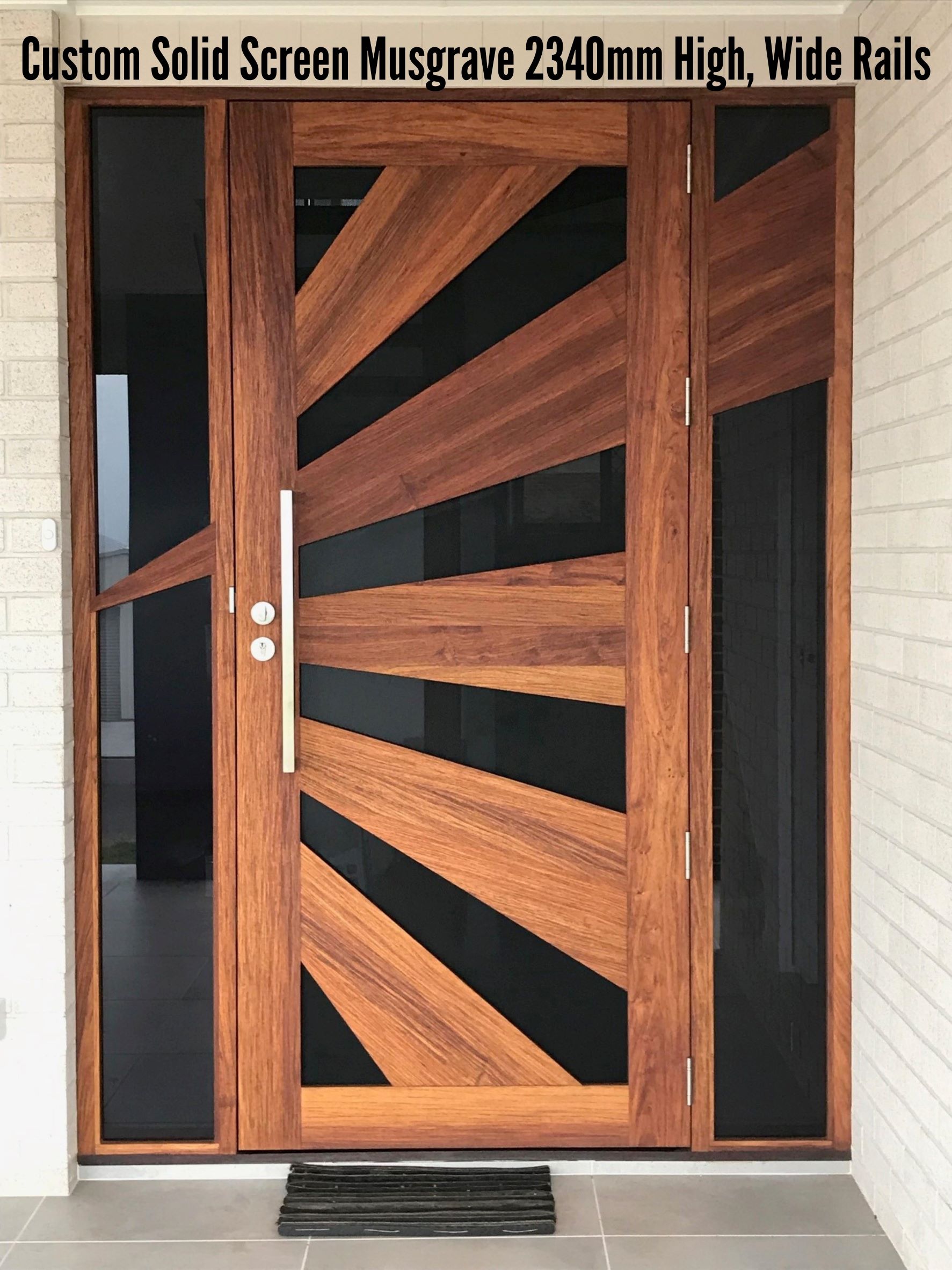 A stunning entrance door to enhance your home. Its sunburst-inspired timber rails, separated by large barrier screen panels, allow both light and air to stream through.