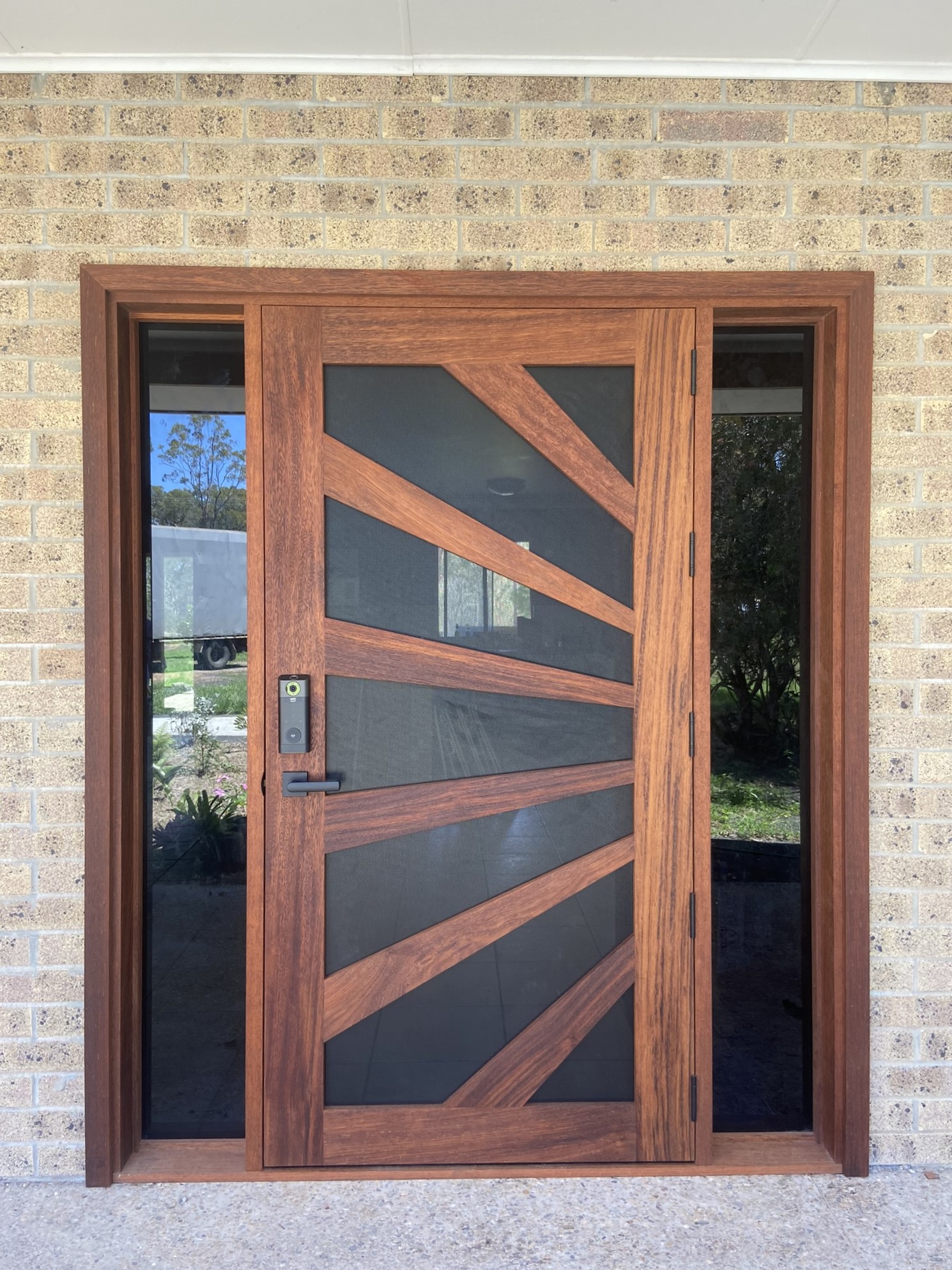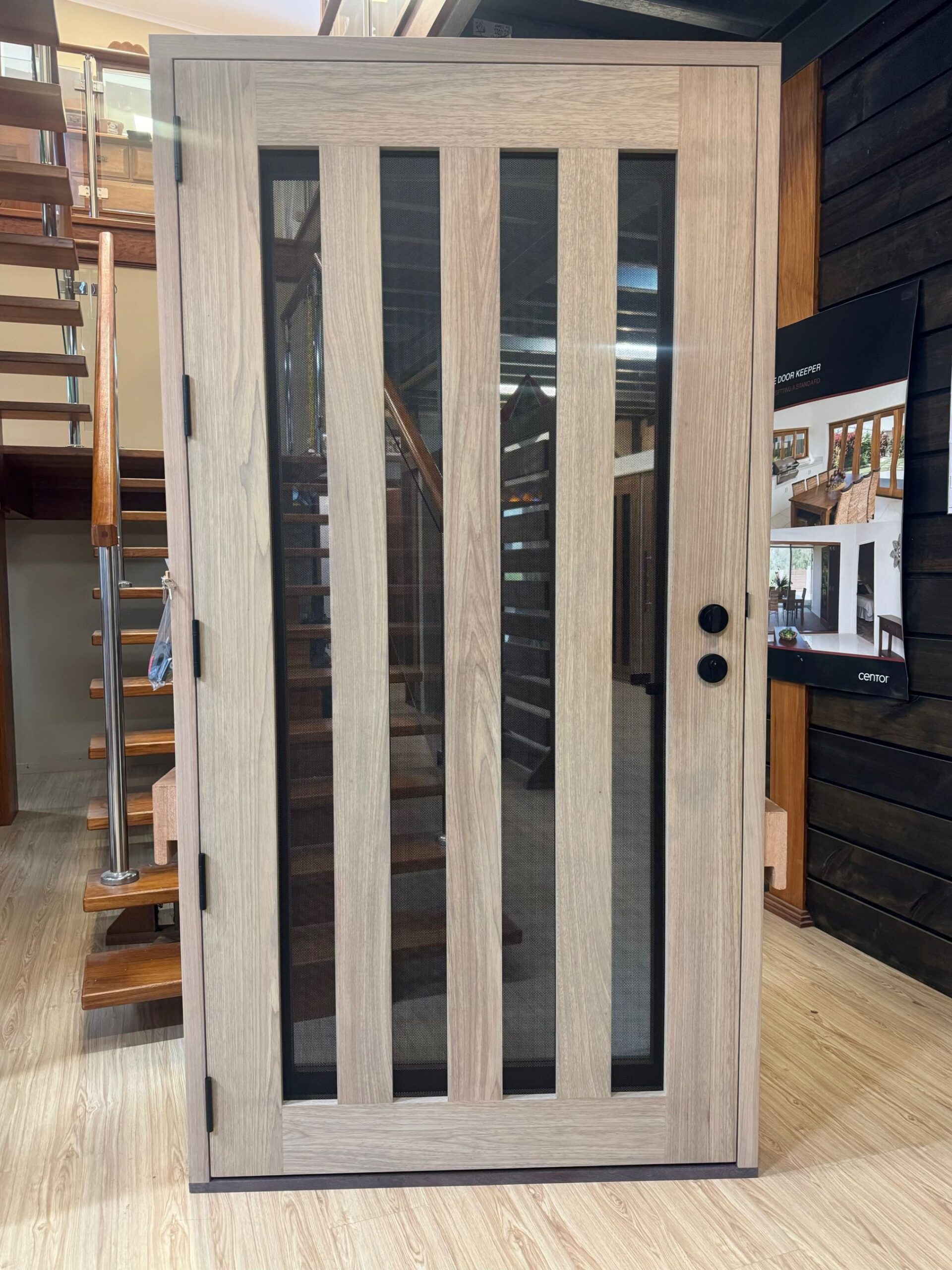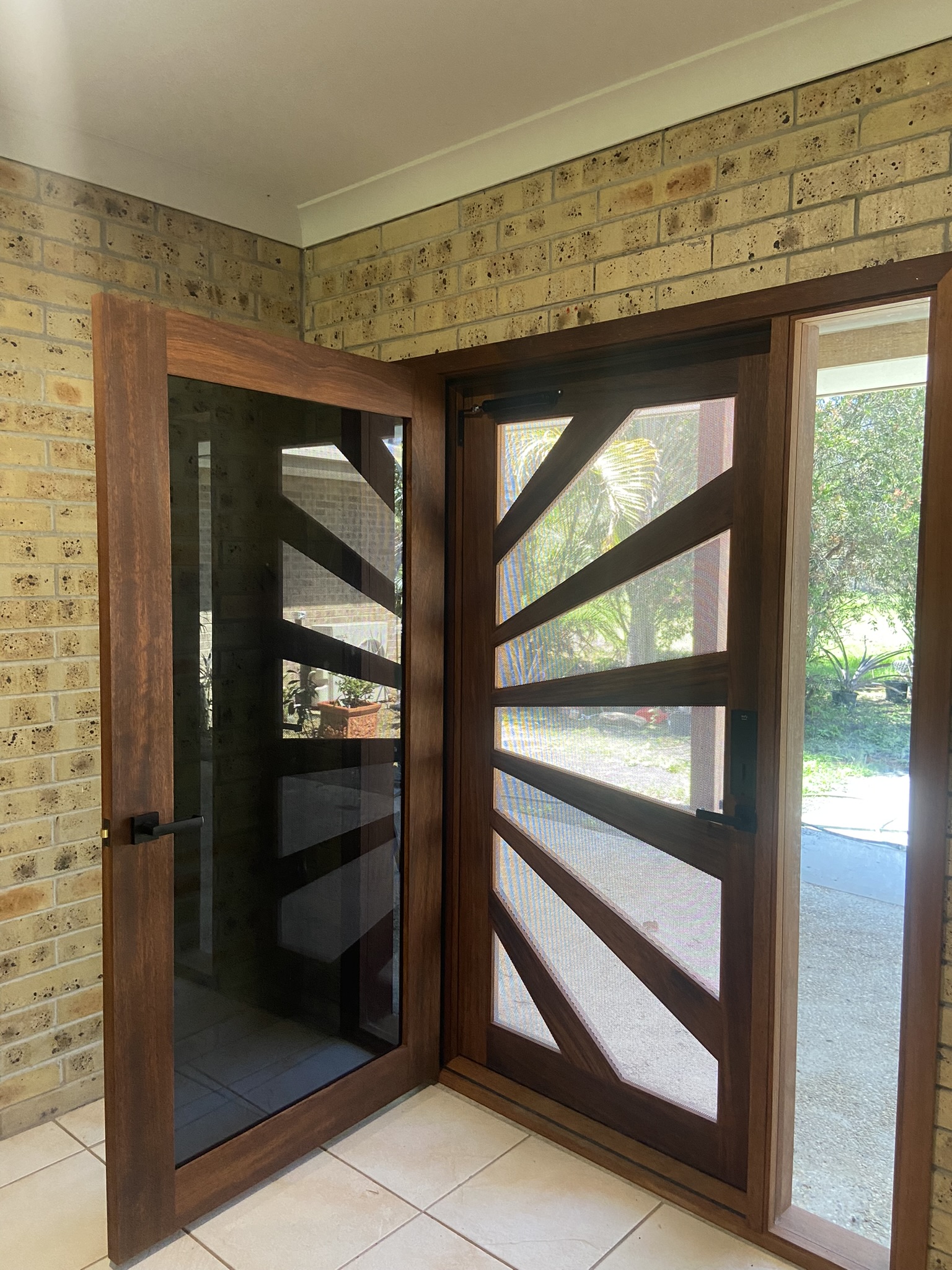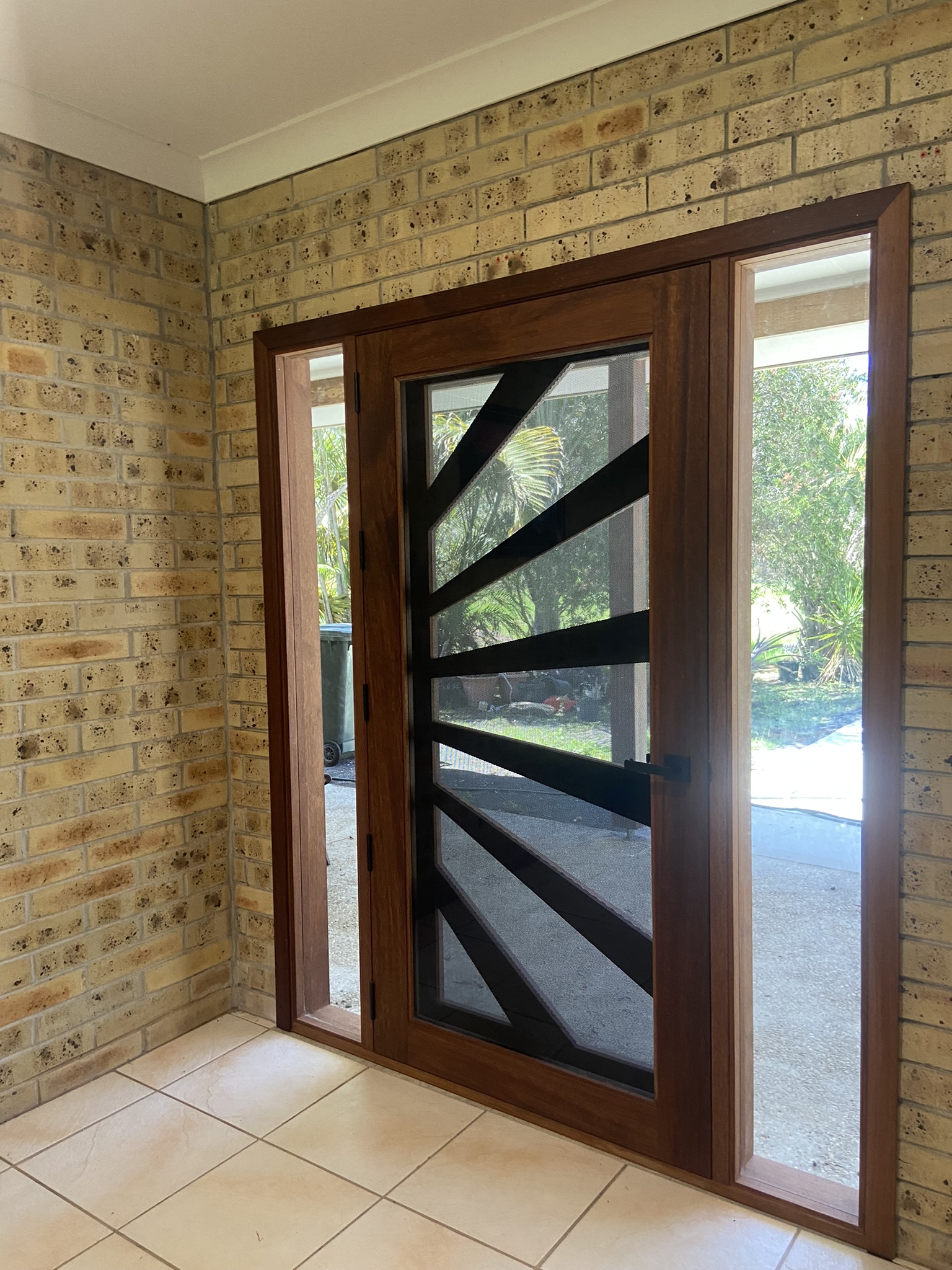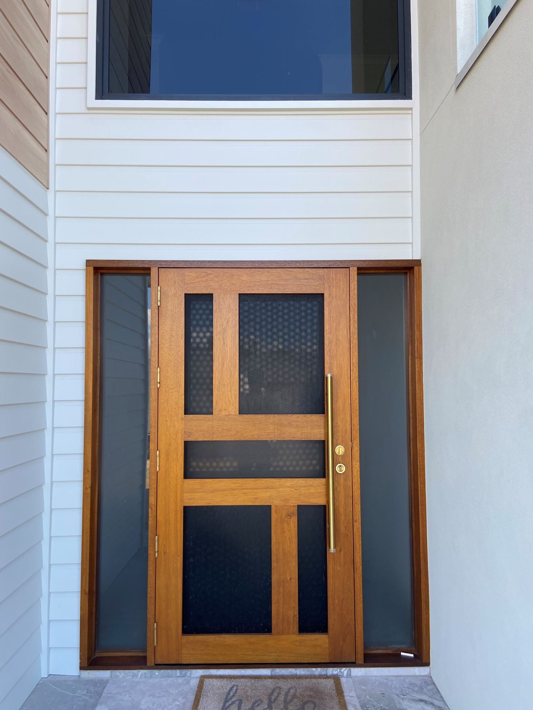 A stunning entrance door to enhance your home. Its sunburst-inspired timber rails, separated by large barrier screen panels, allow both light and air to stream through.