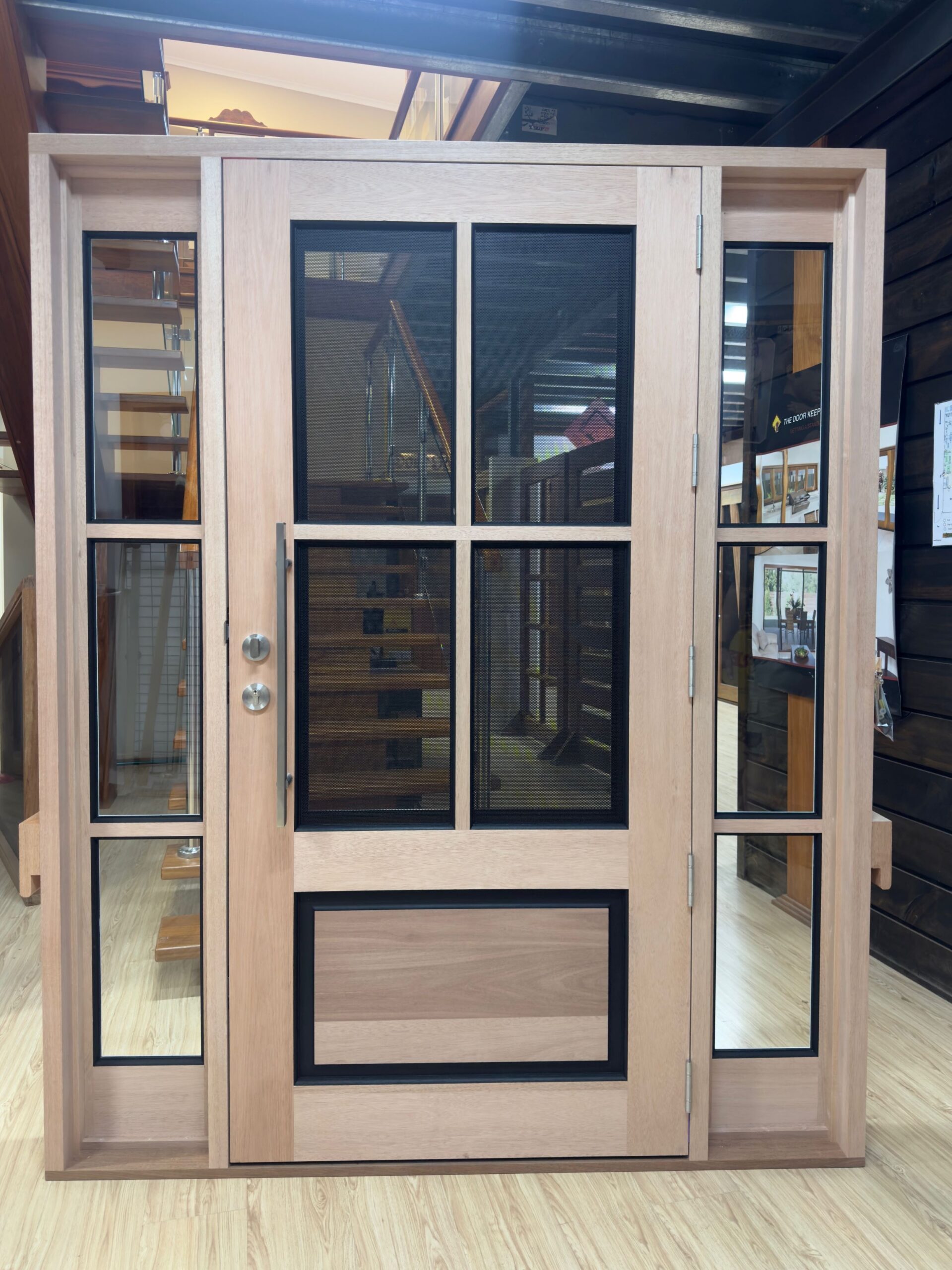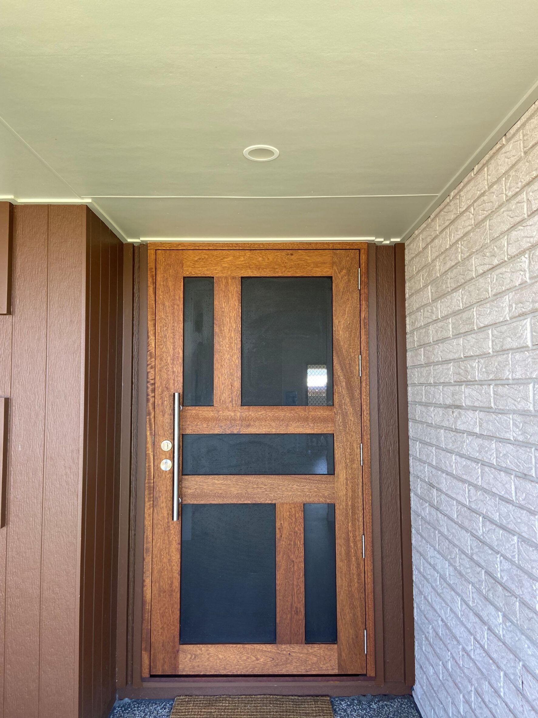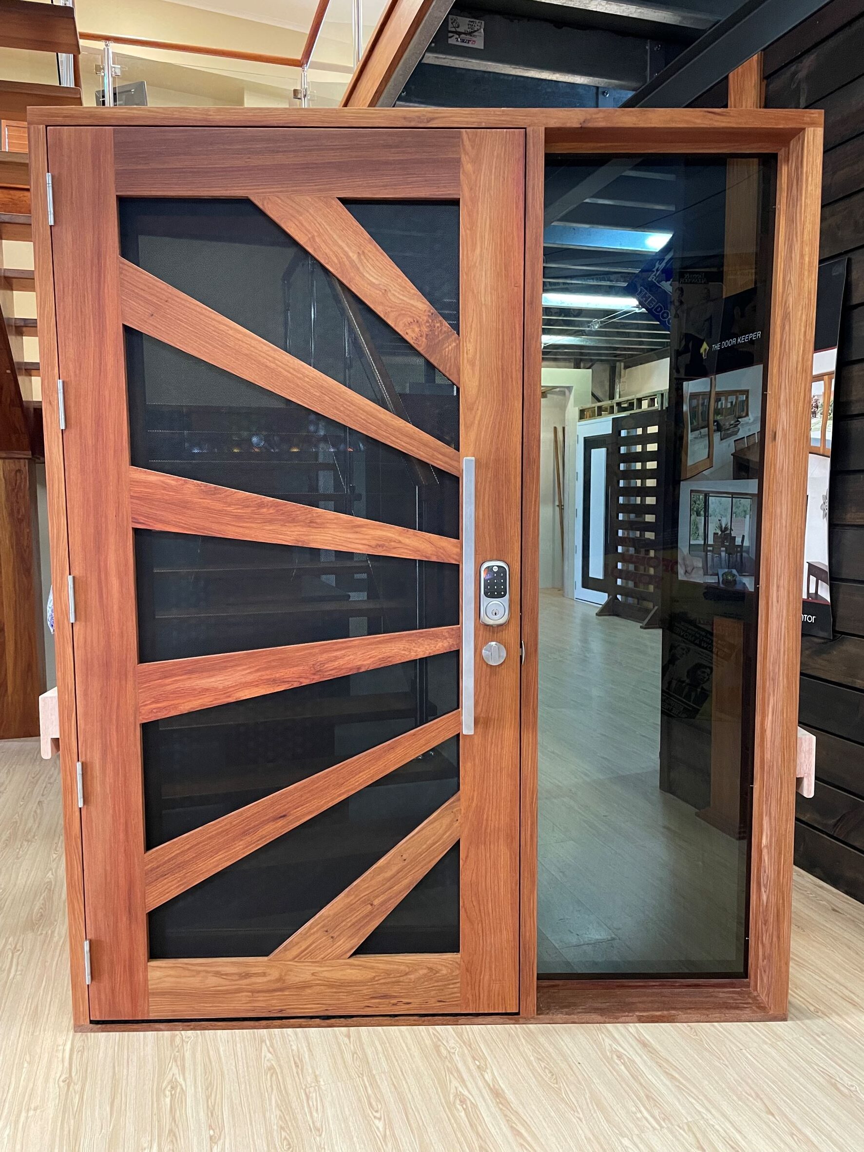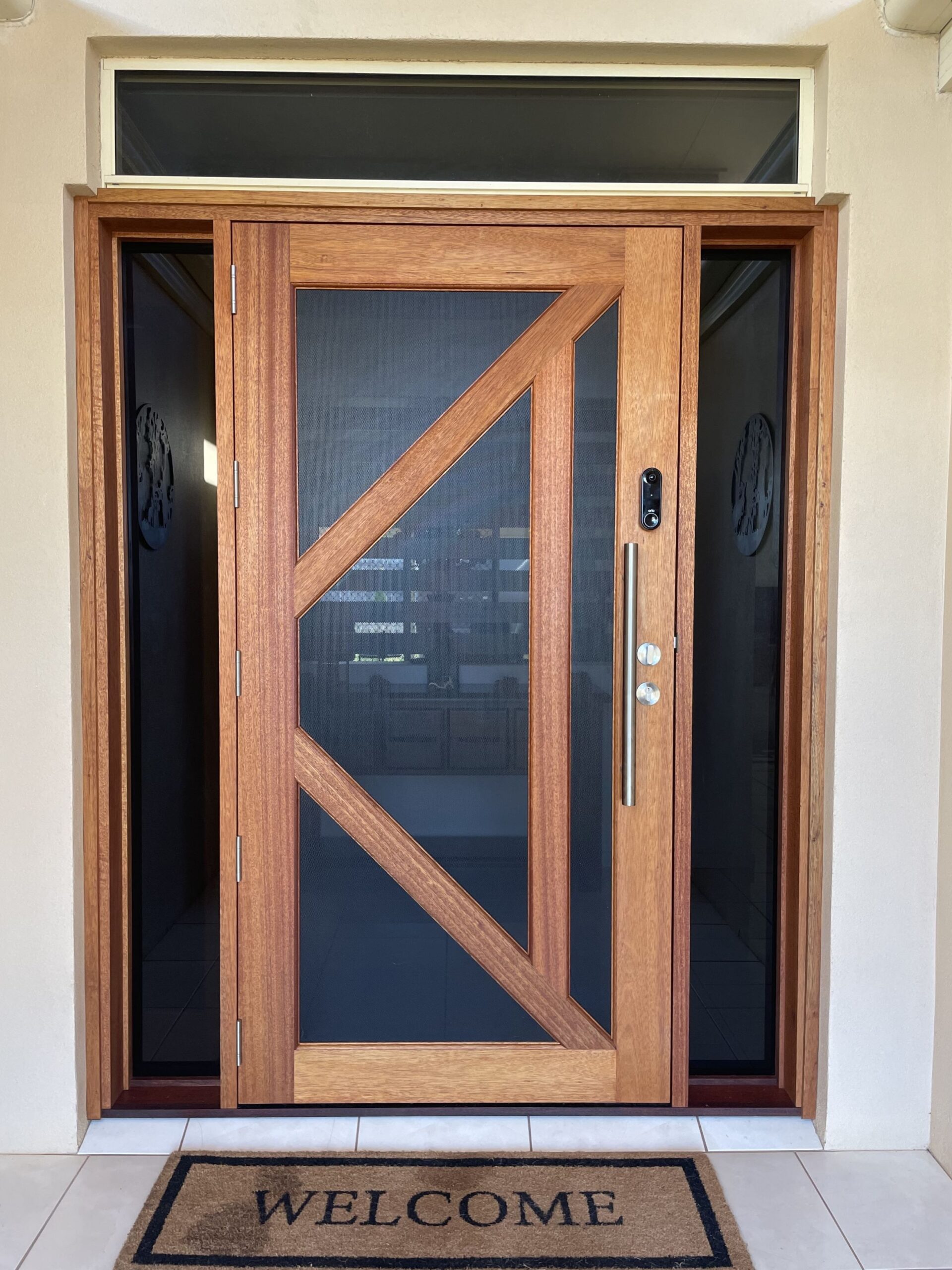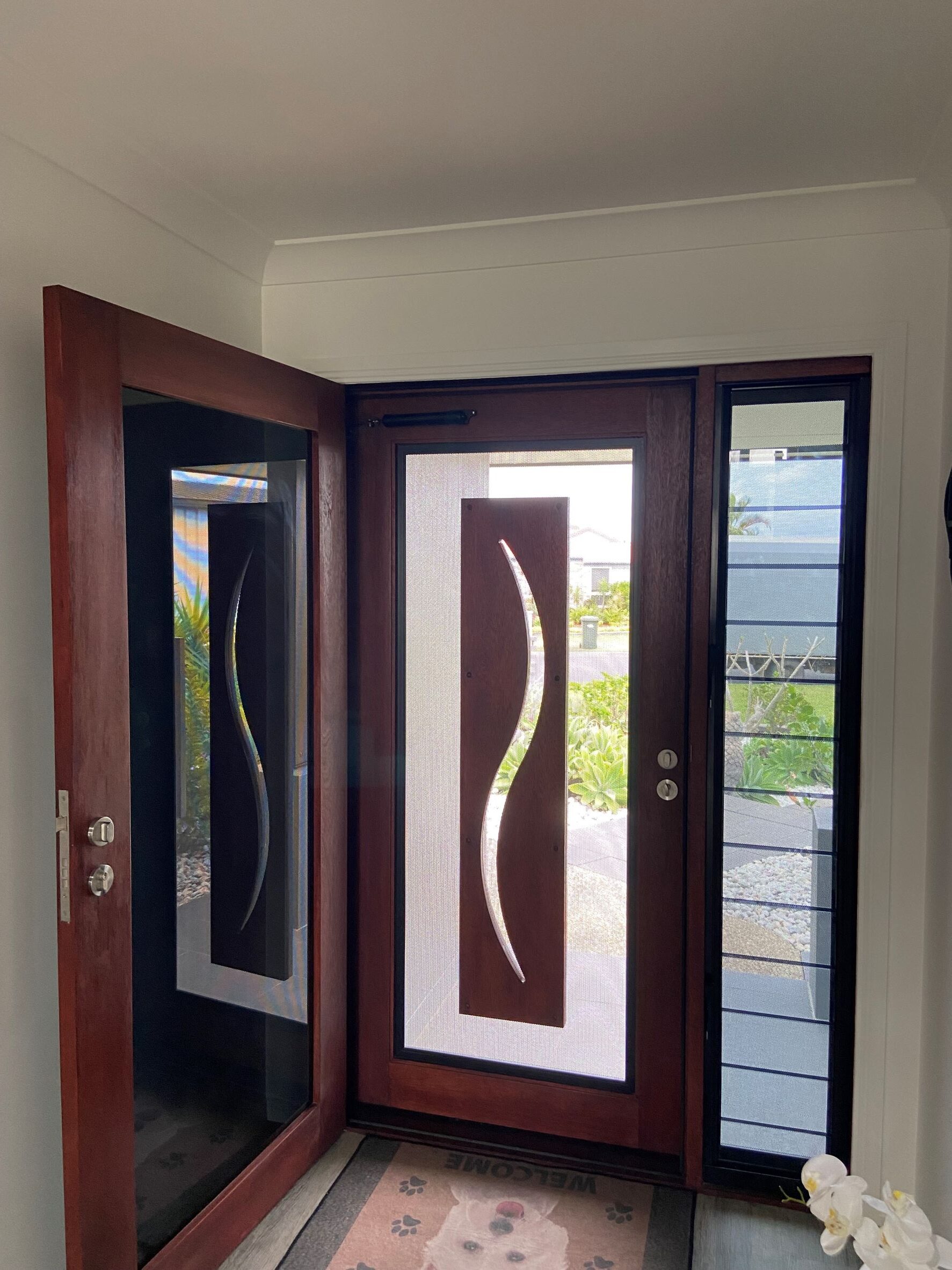 A stunning entrance door to enhance your home. Its sunburst-inspired timber rails, separated by large barrier screen panels, allow both light and air to stream through.