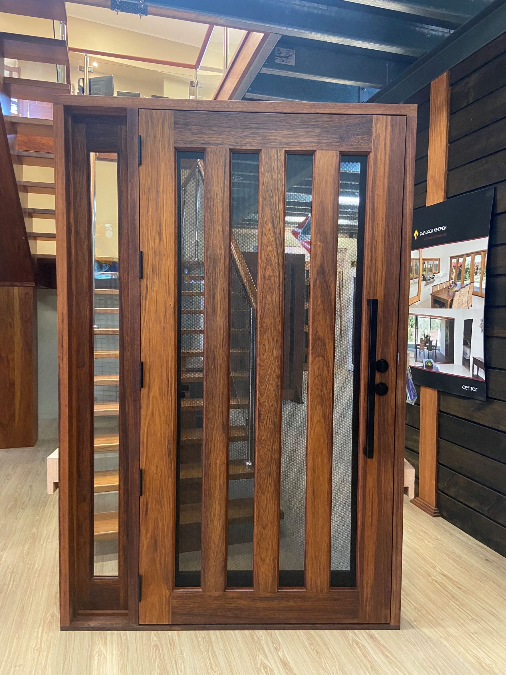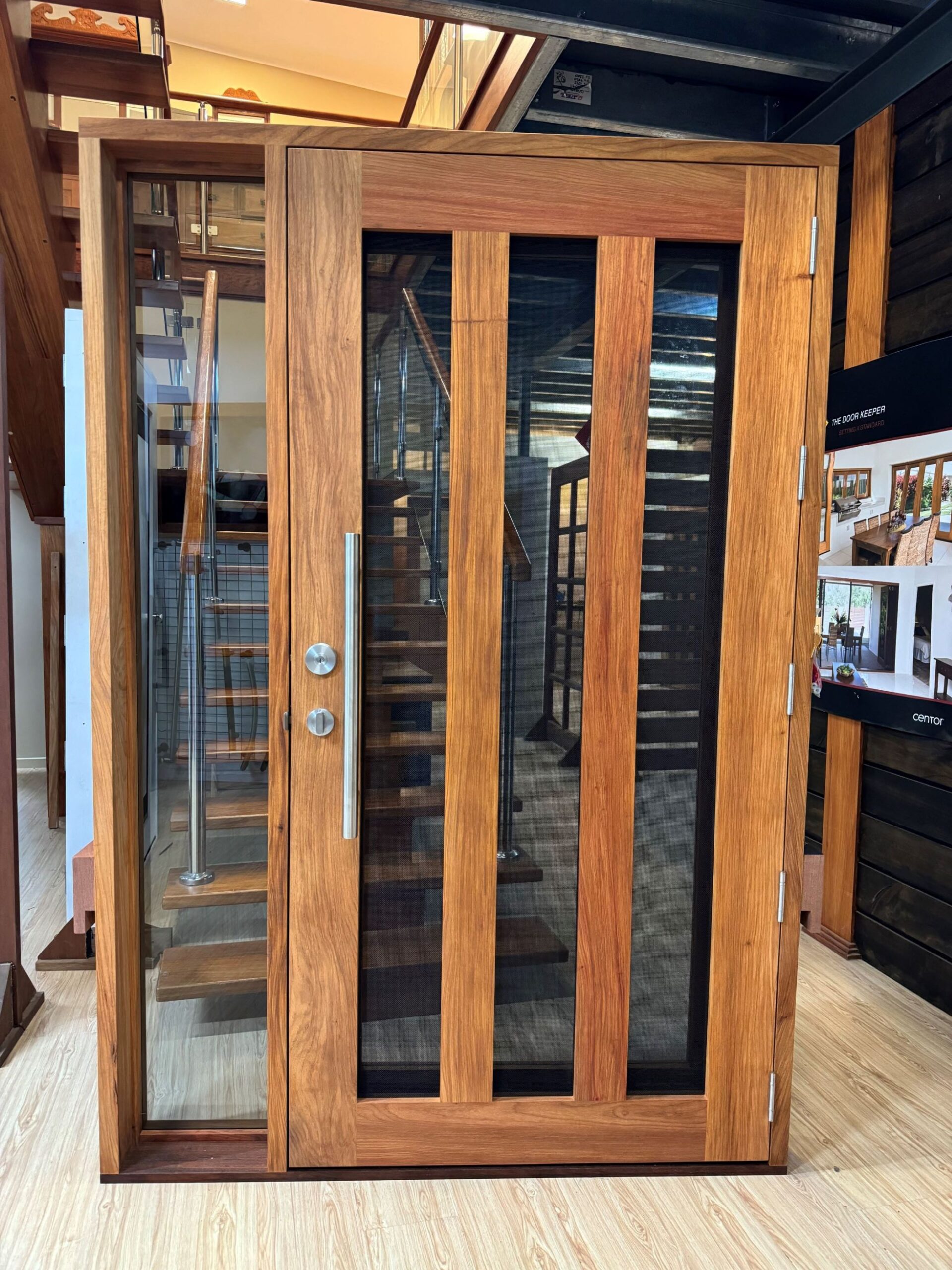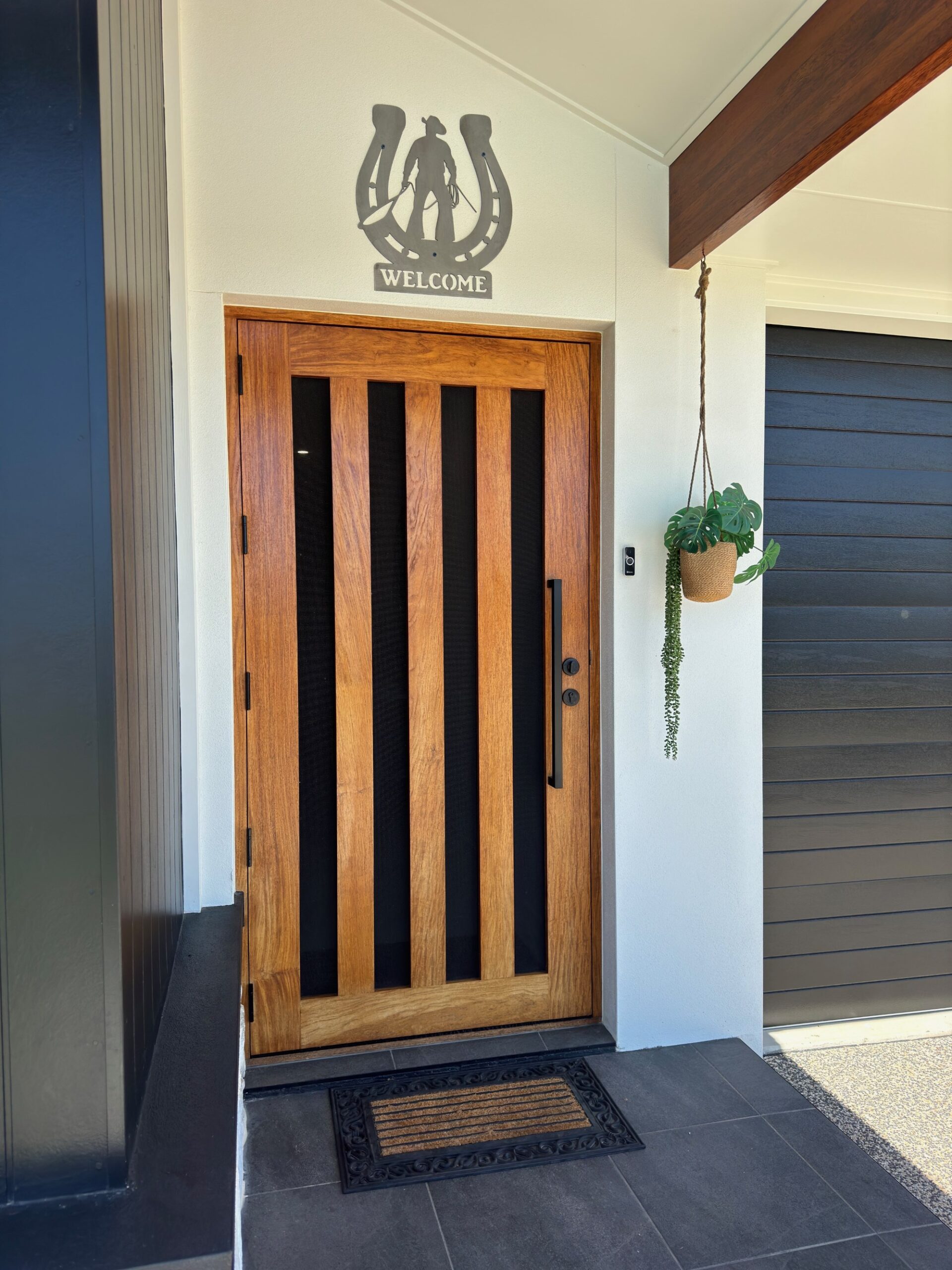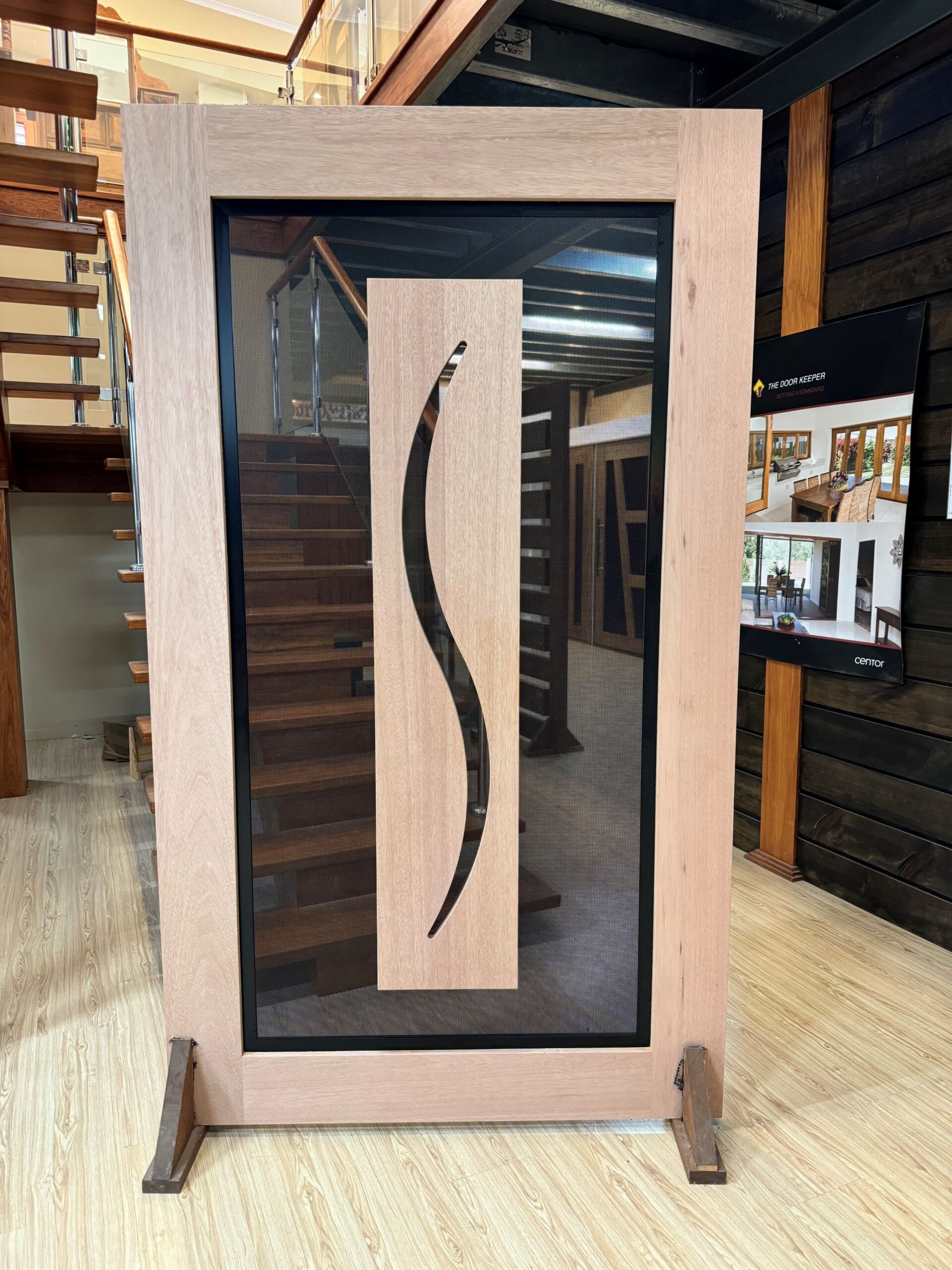 A stunning entrance door to enhance your home. Its sunburst-inspired timber rails, separated by large barrier screen panels, allow both light and air to stream through.