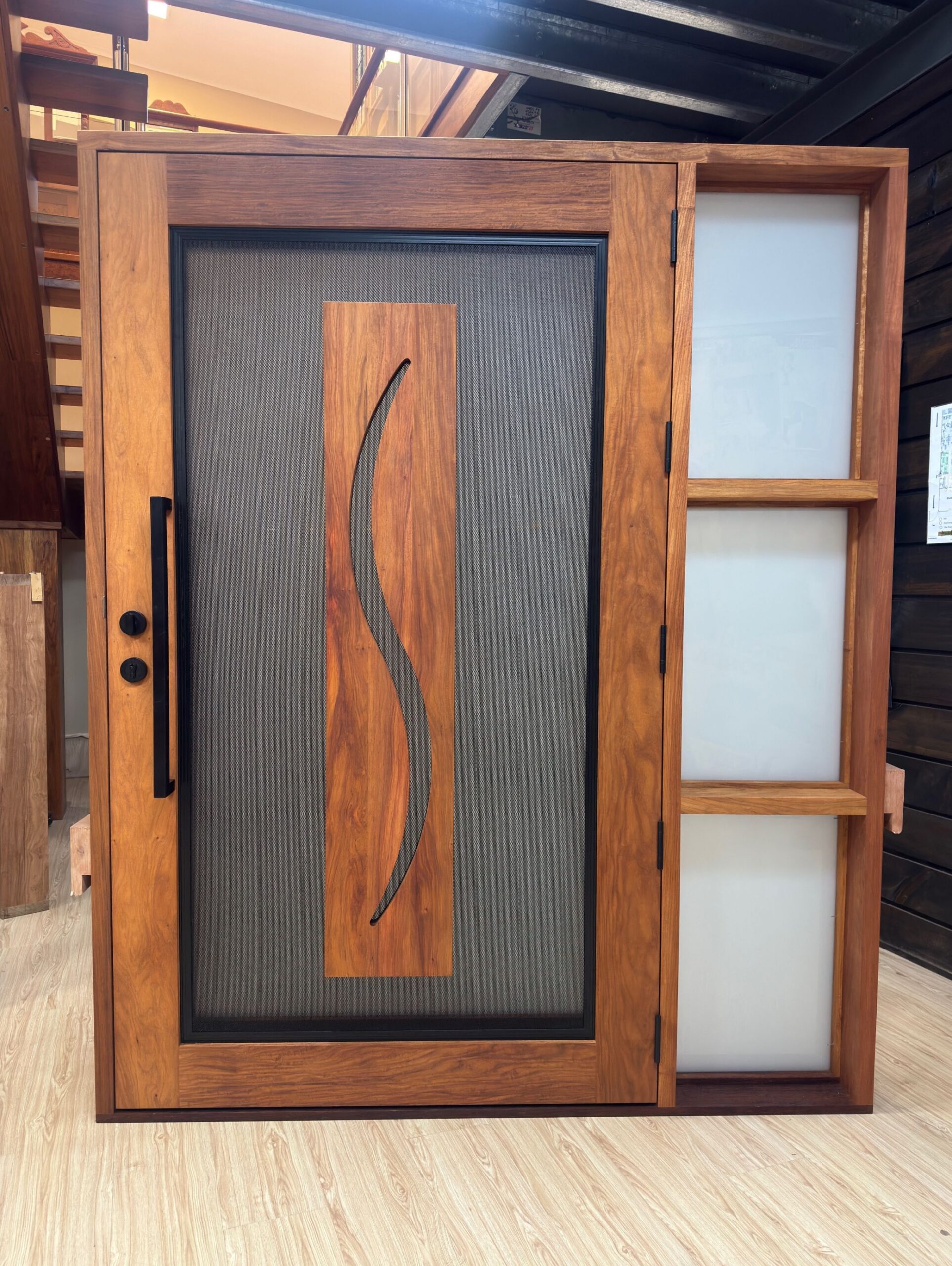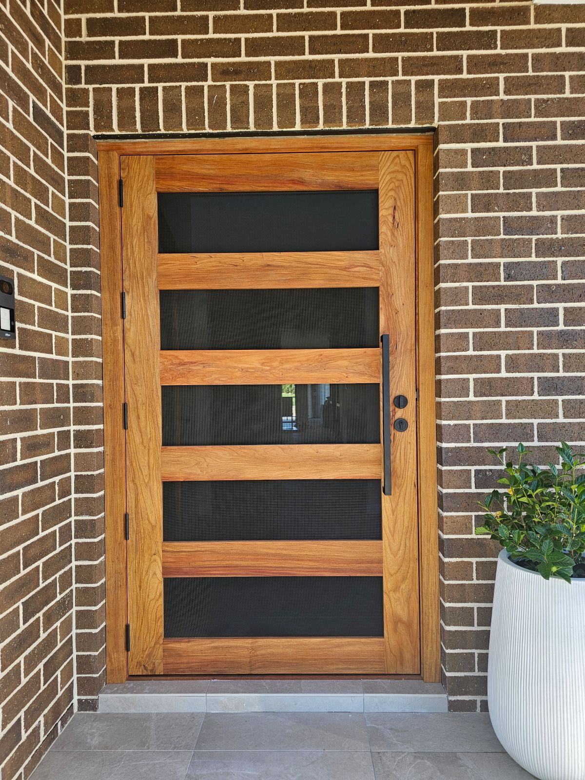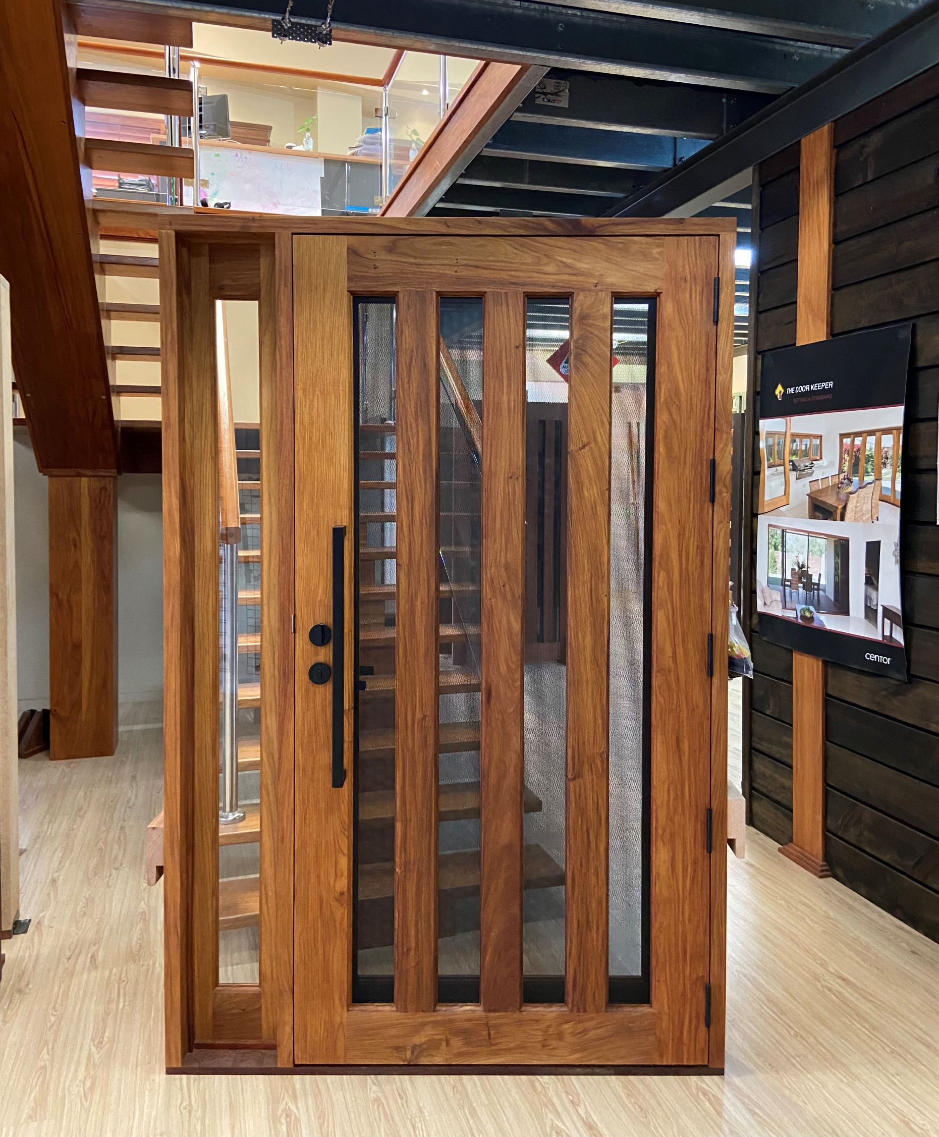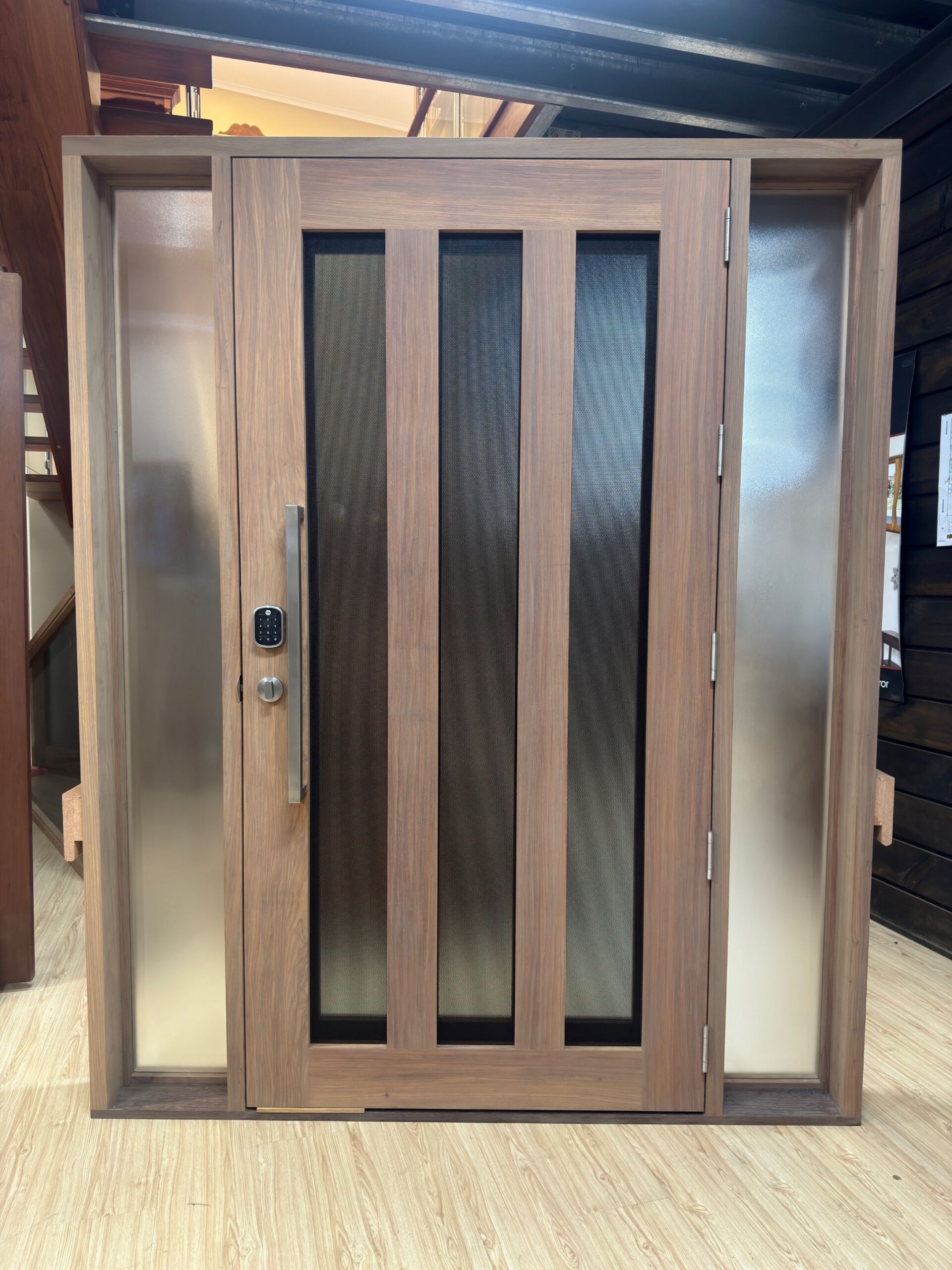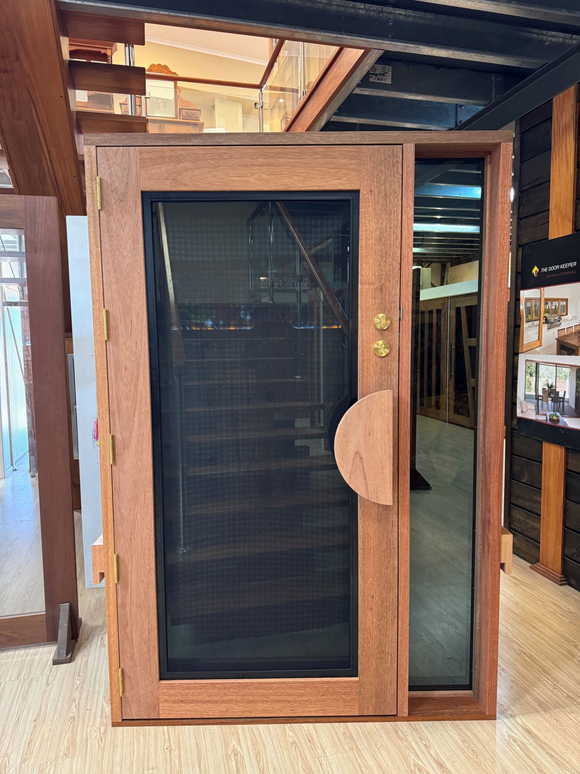 A stunning entrance door to enhance your home. Its sunburst-inspired timber rails, separated by large barrier screen panels, allow both light and air to stream through.