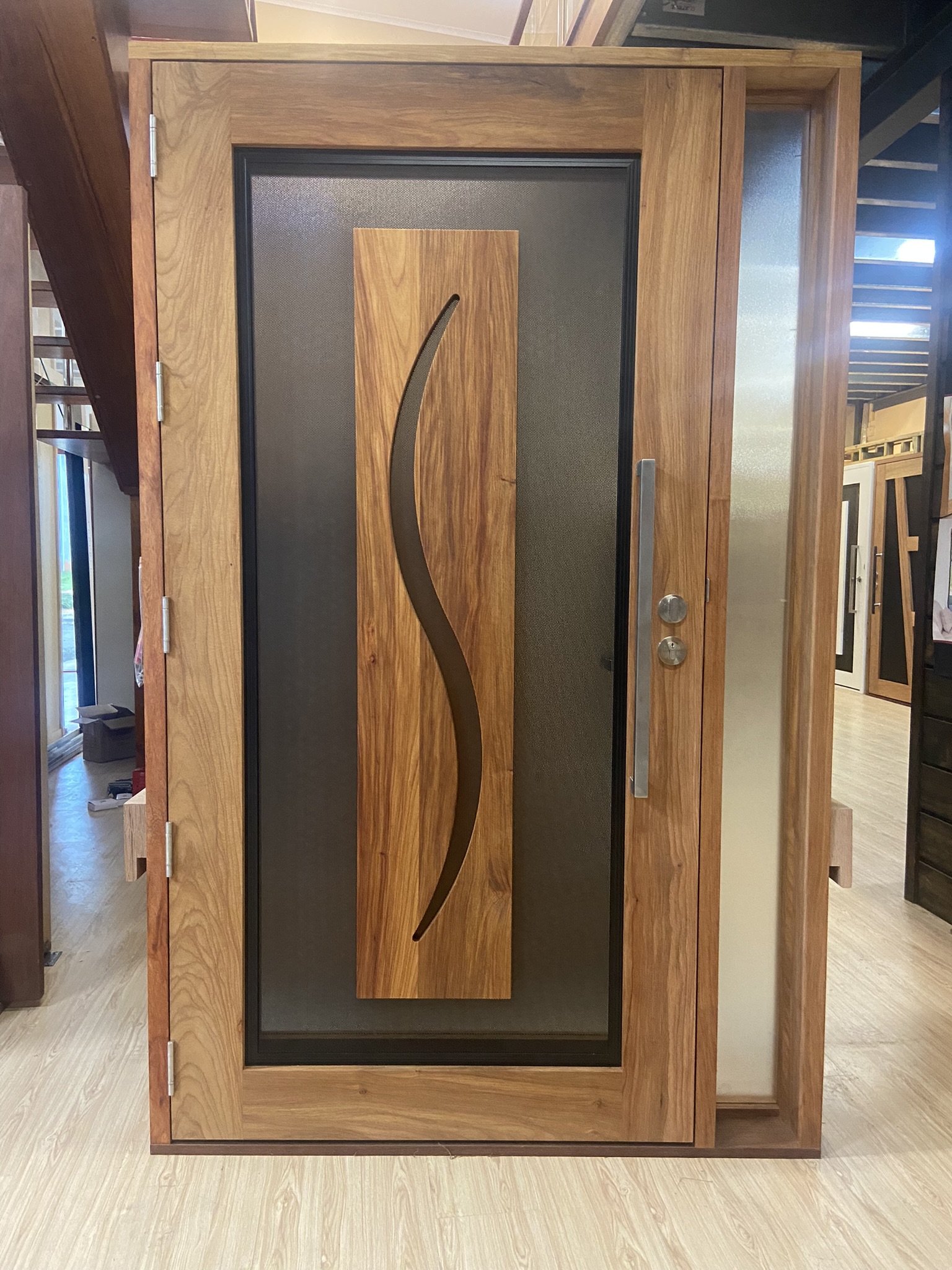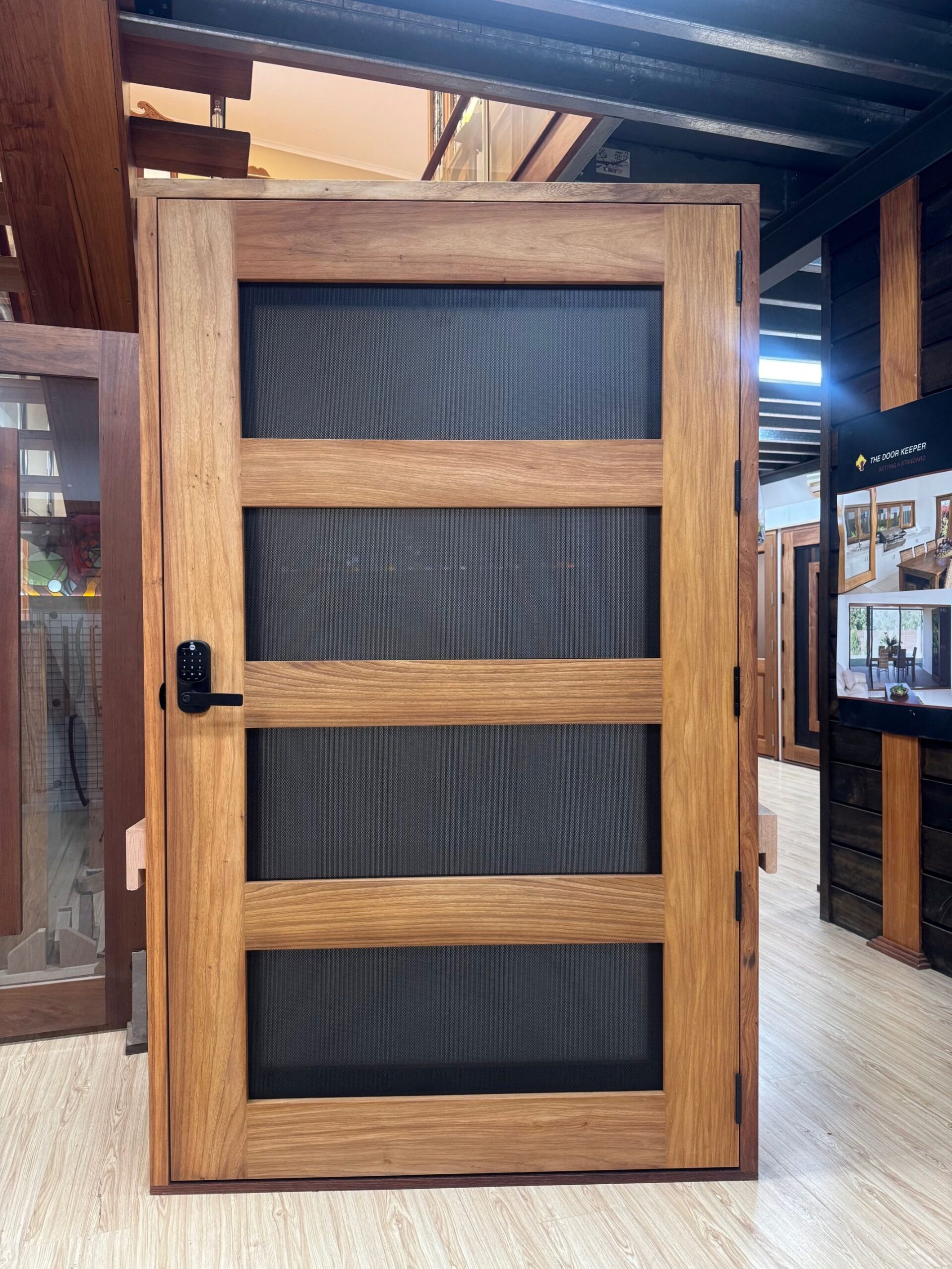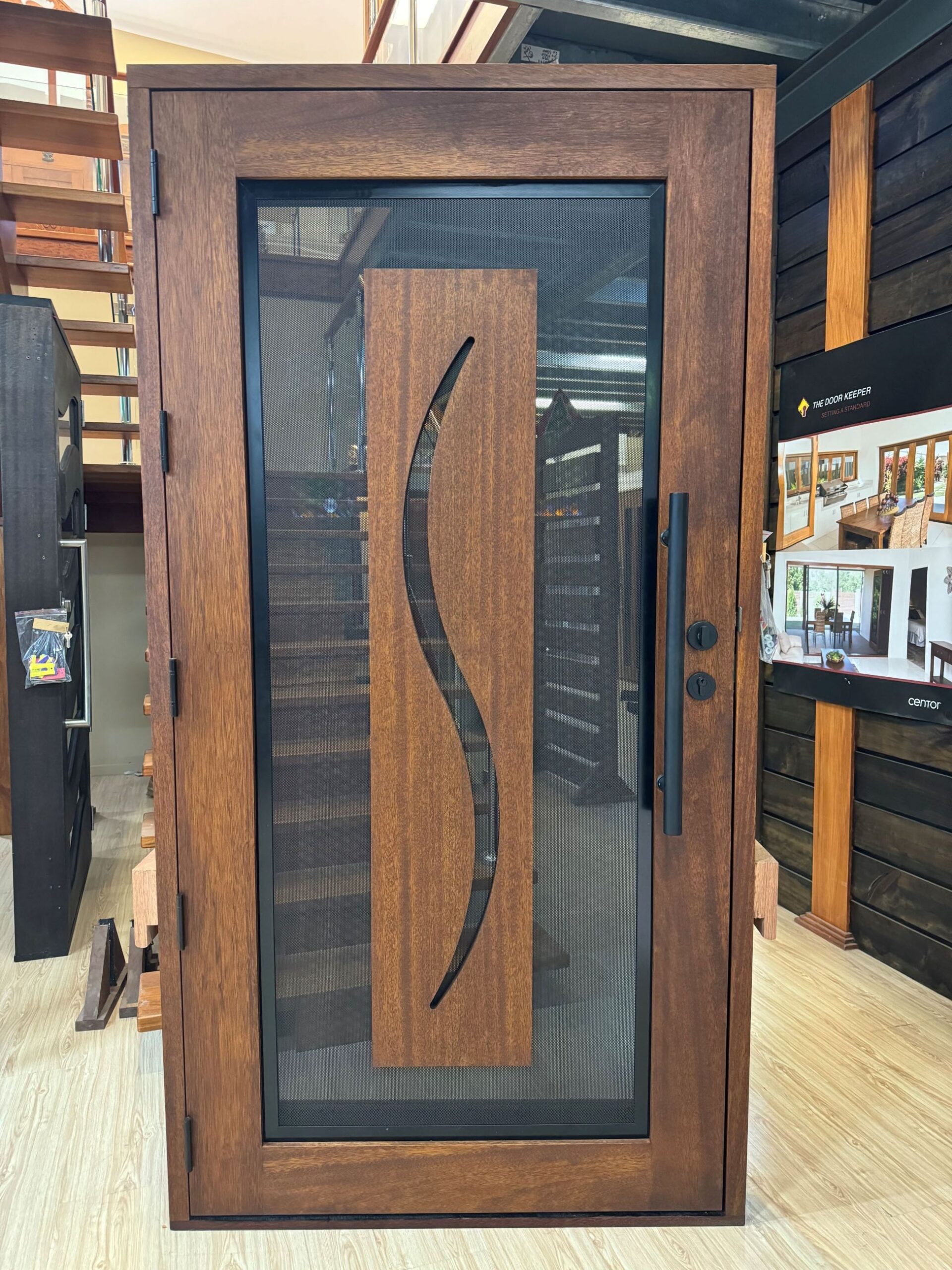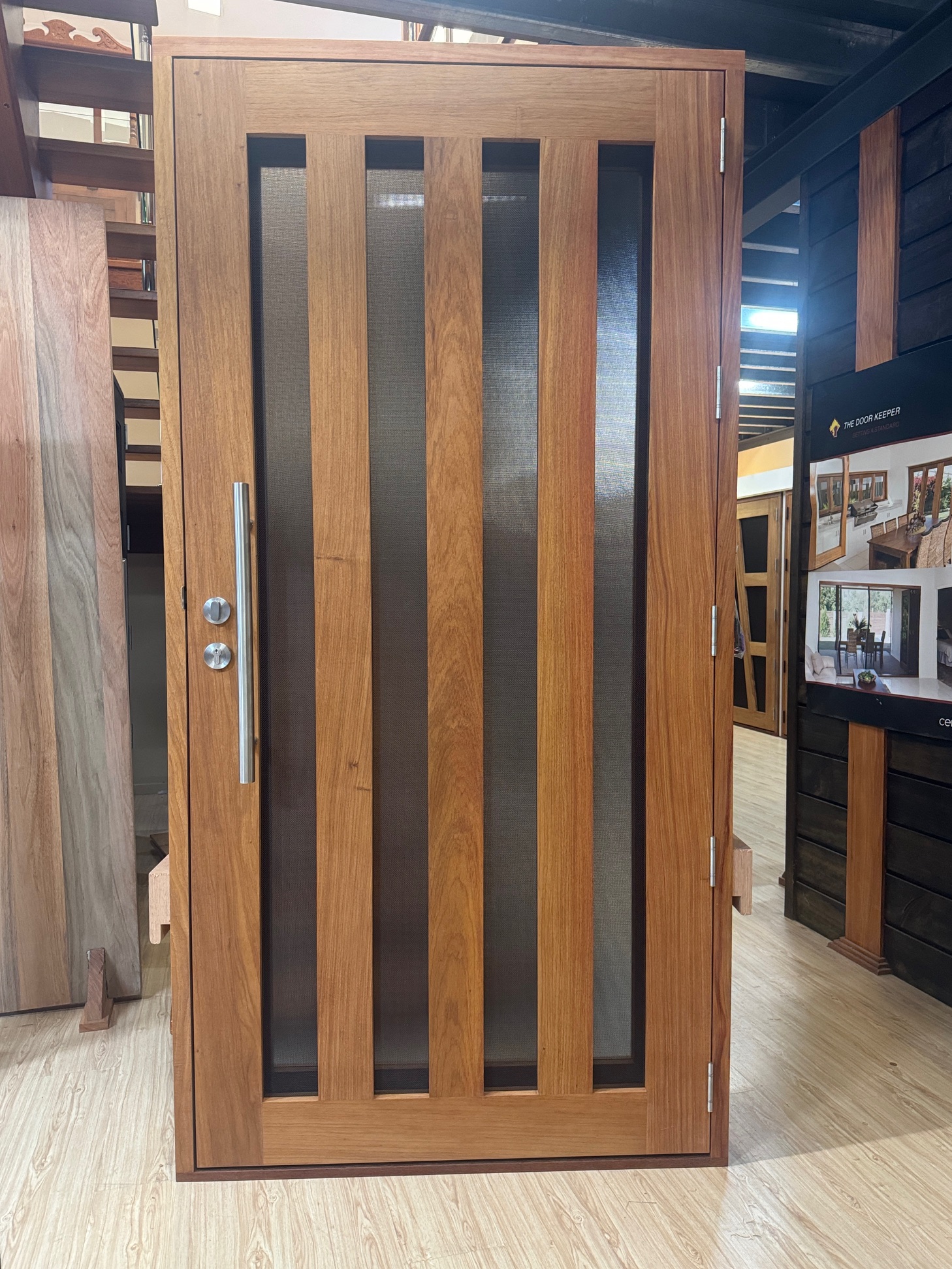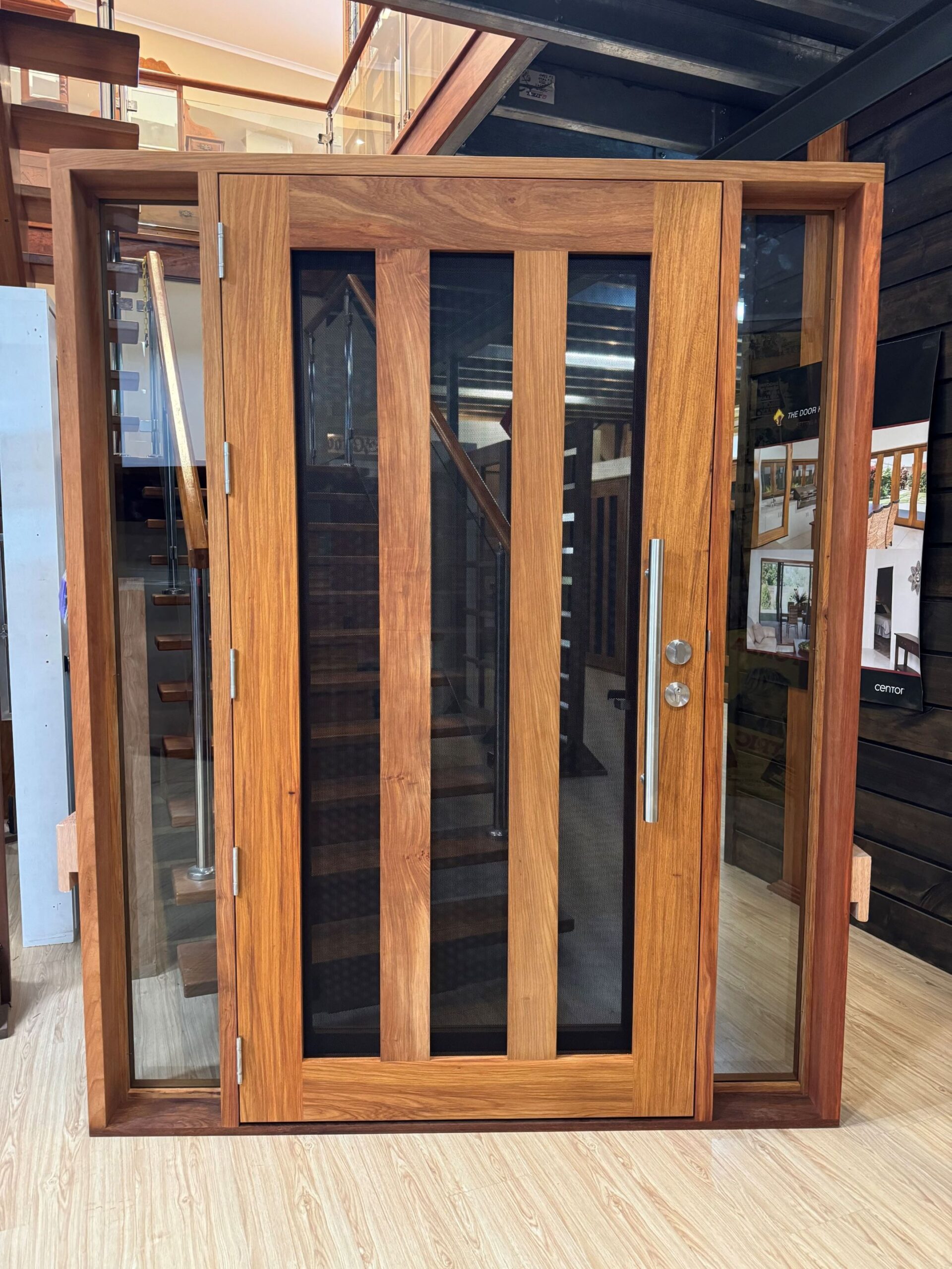 A stunning entrance door to enhance your home. Its sunburst-inspired timber rails, separated by large barrier screen panels, allow both light and air to stream through.