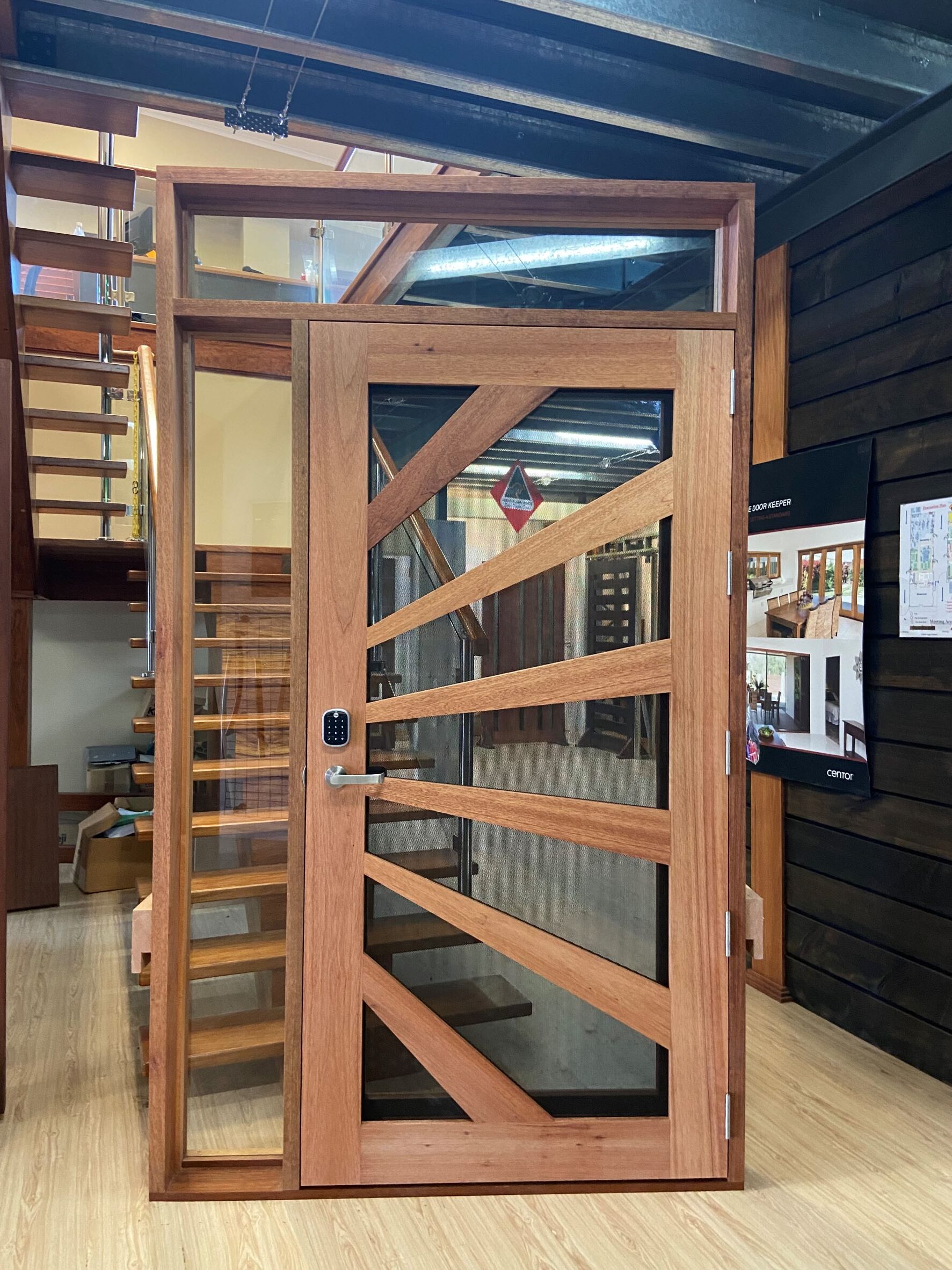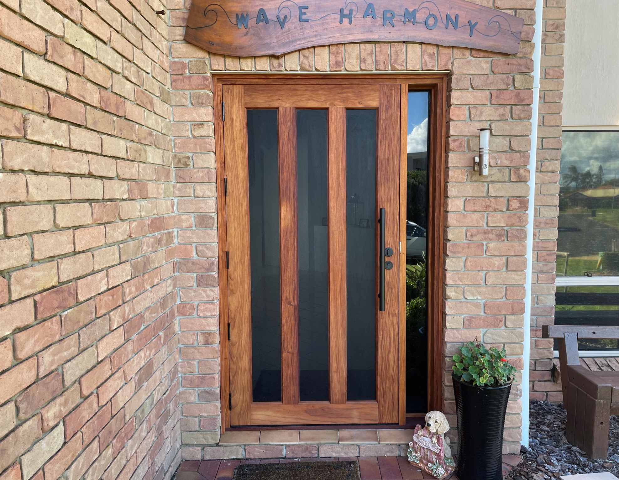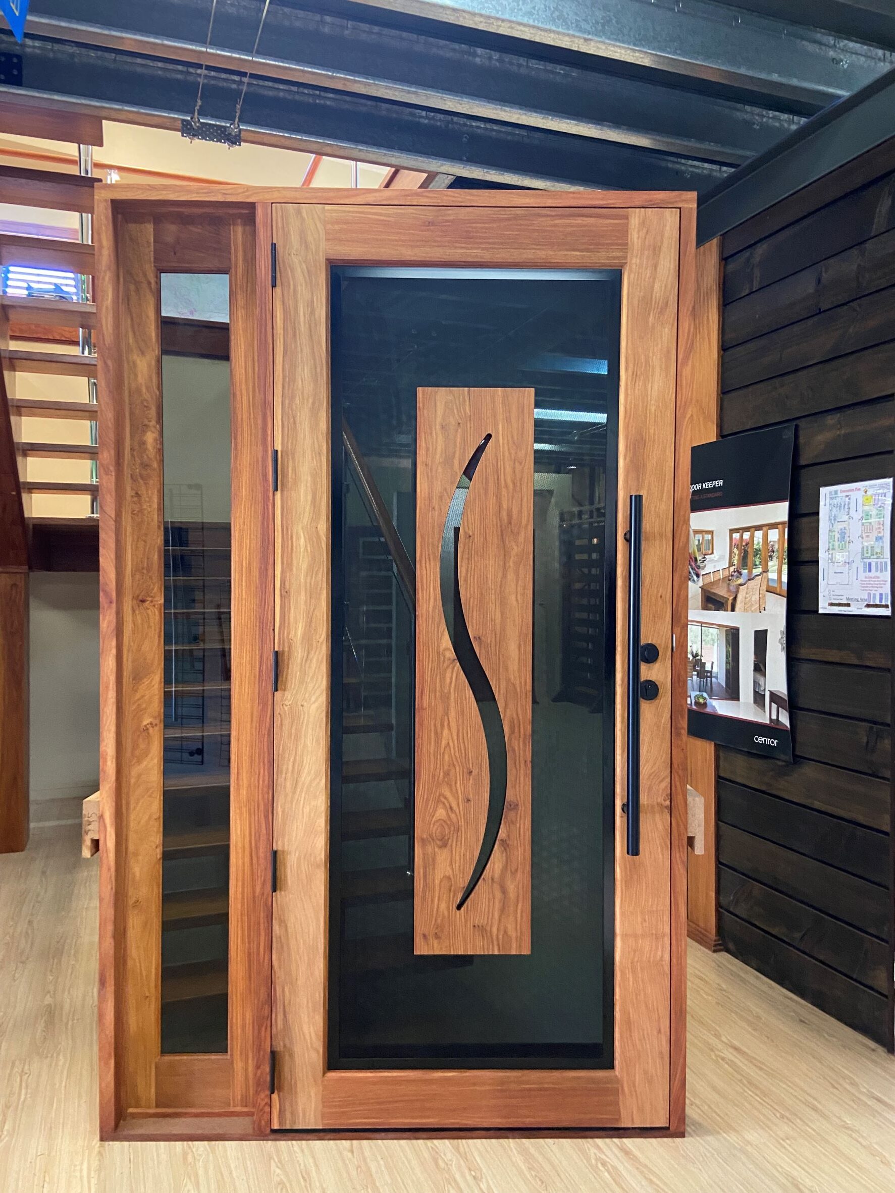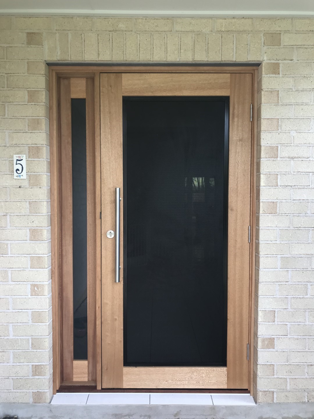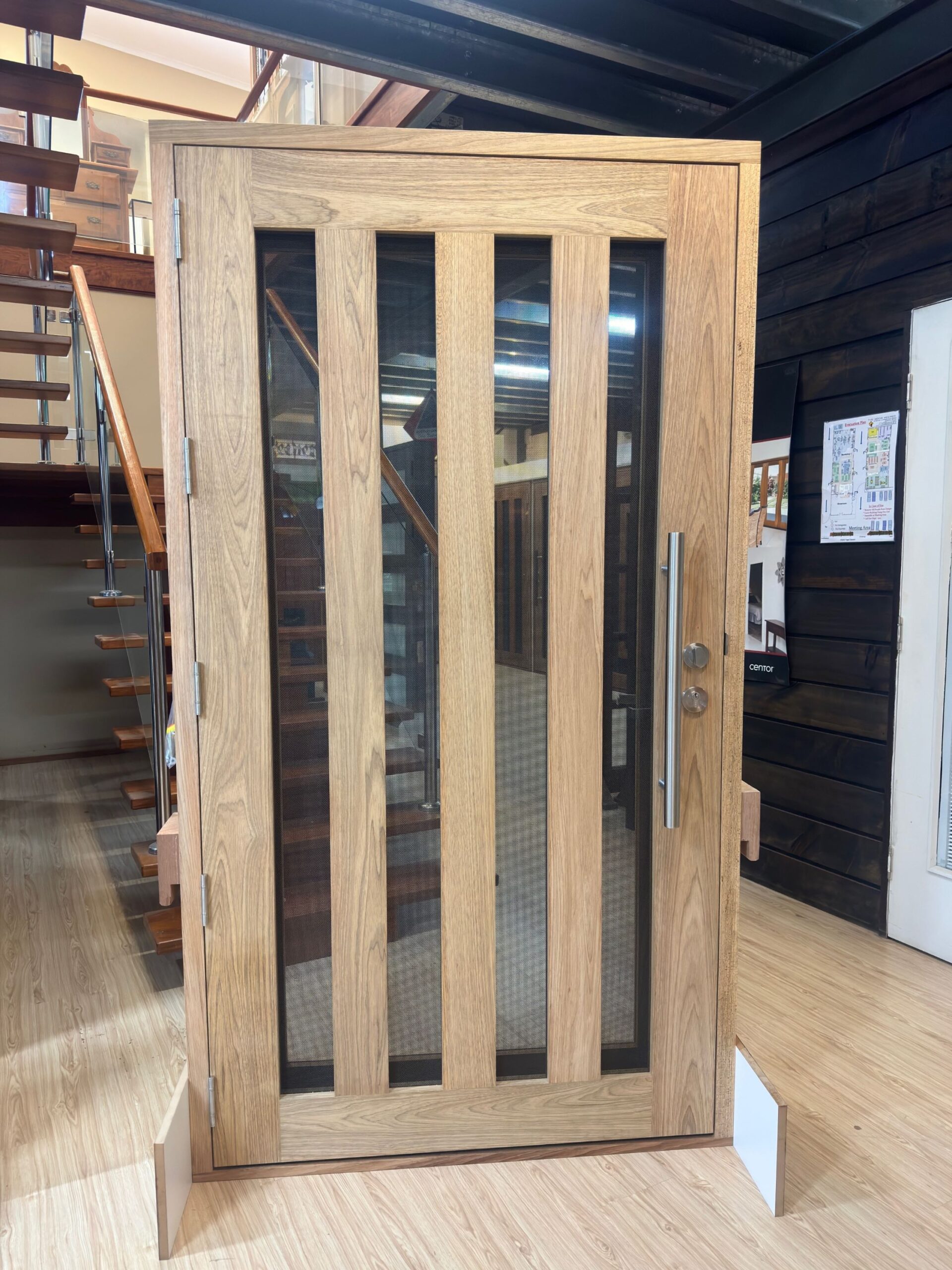 A stunning entrance door to enhance your home. Its sunburst-inspired timber rails, separated by large barrier screen panels, allow both light and air to stream through.