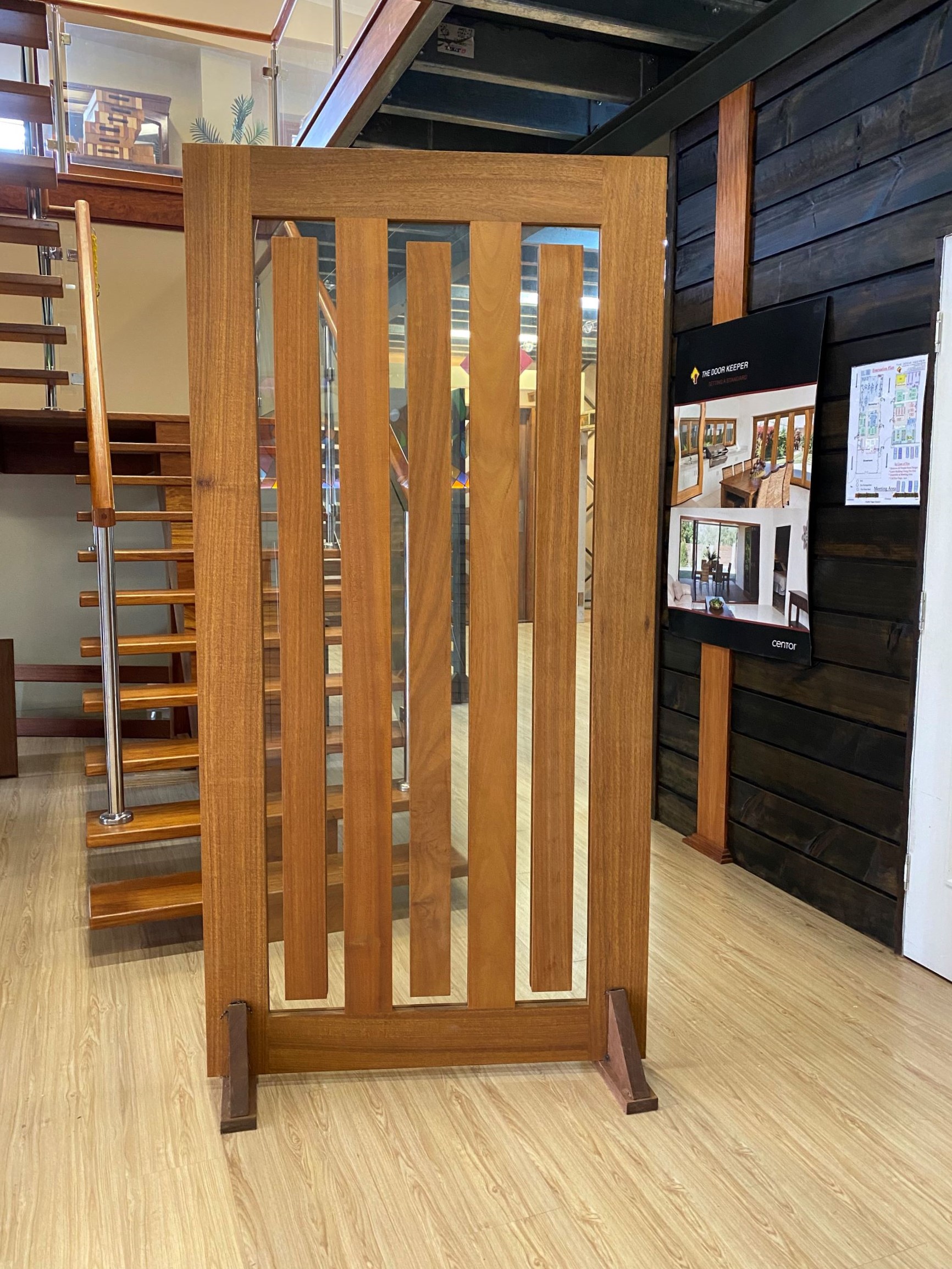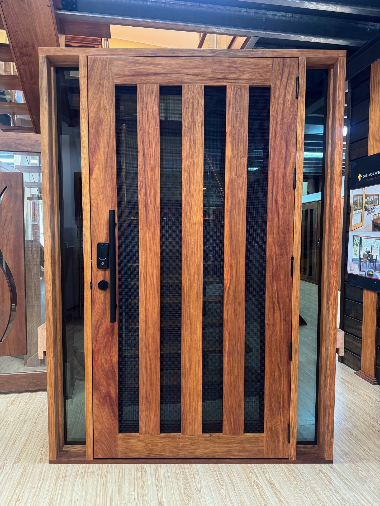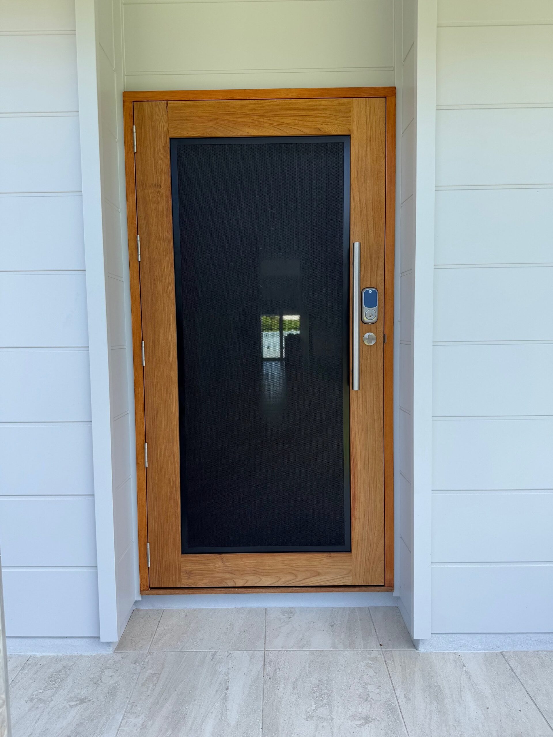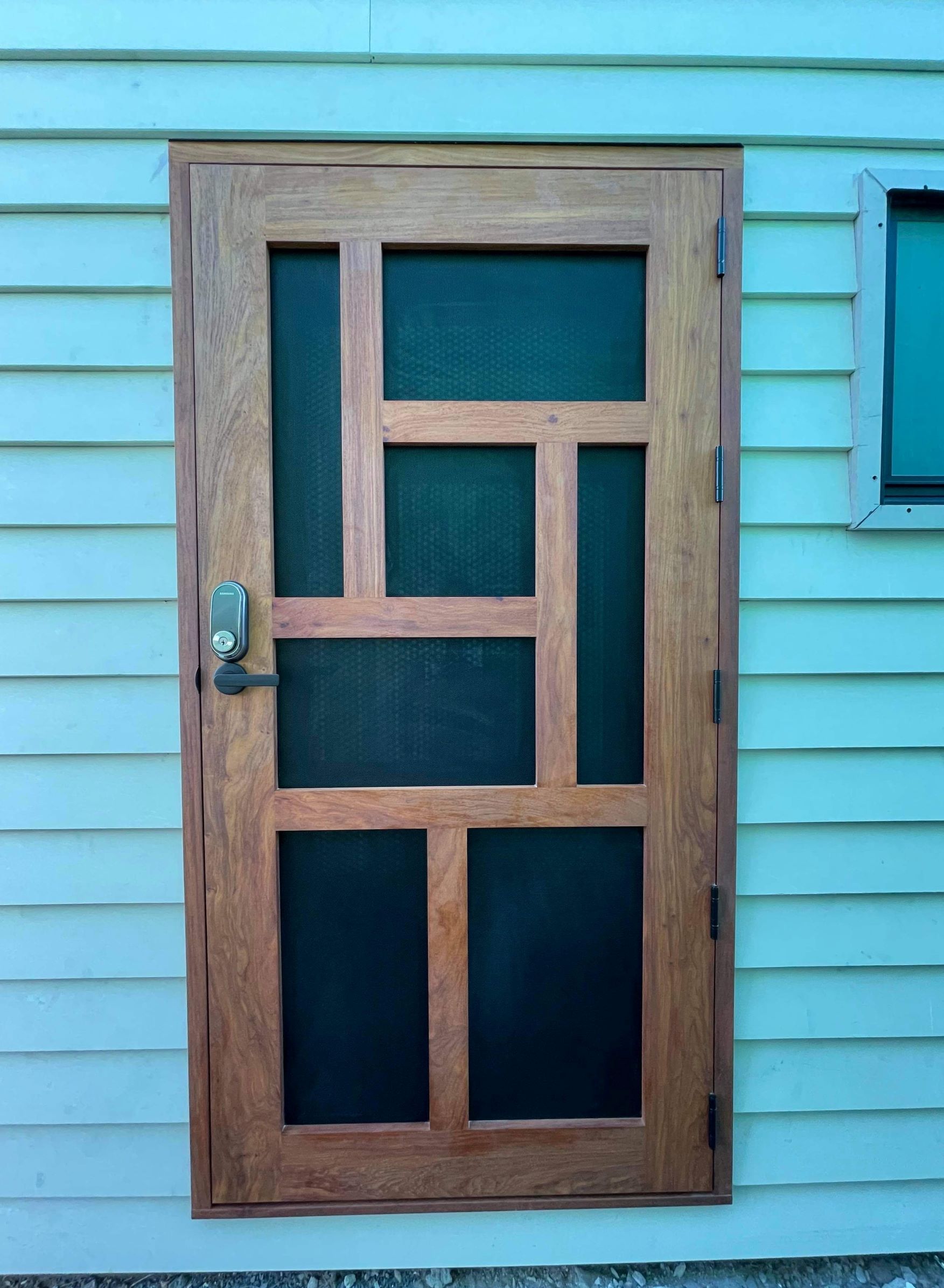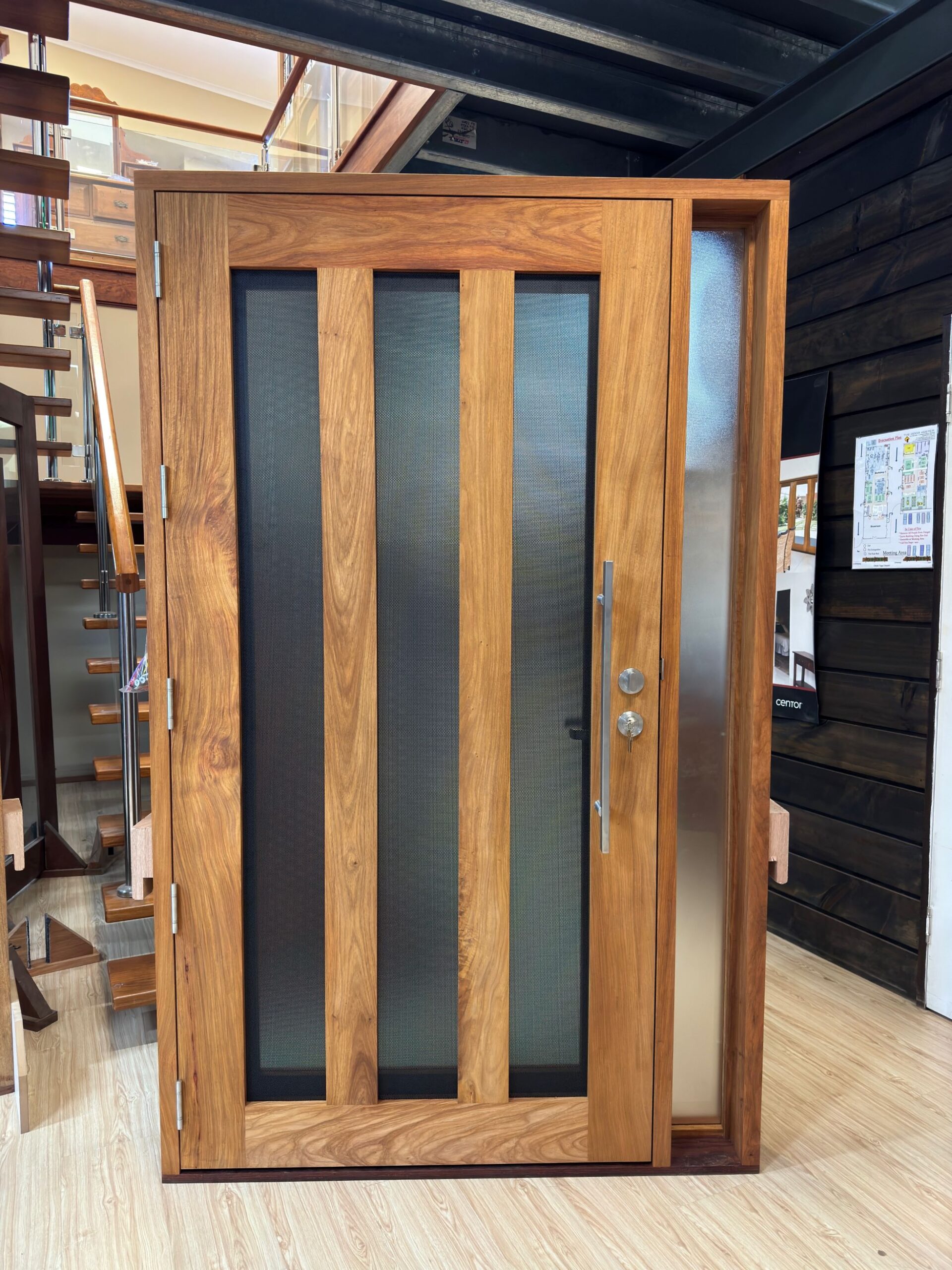 A stunning entrance door to enhance your home. Its sunburst-inspired timber rails, separated by large barrier screen panels, allow both light and air to stream through.