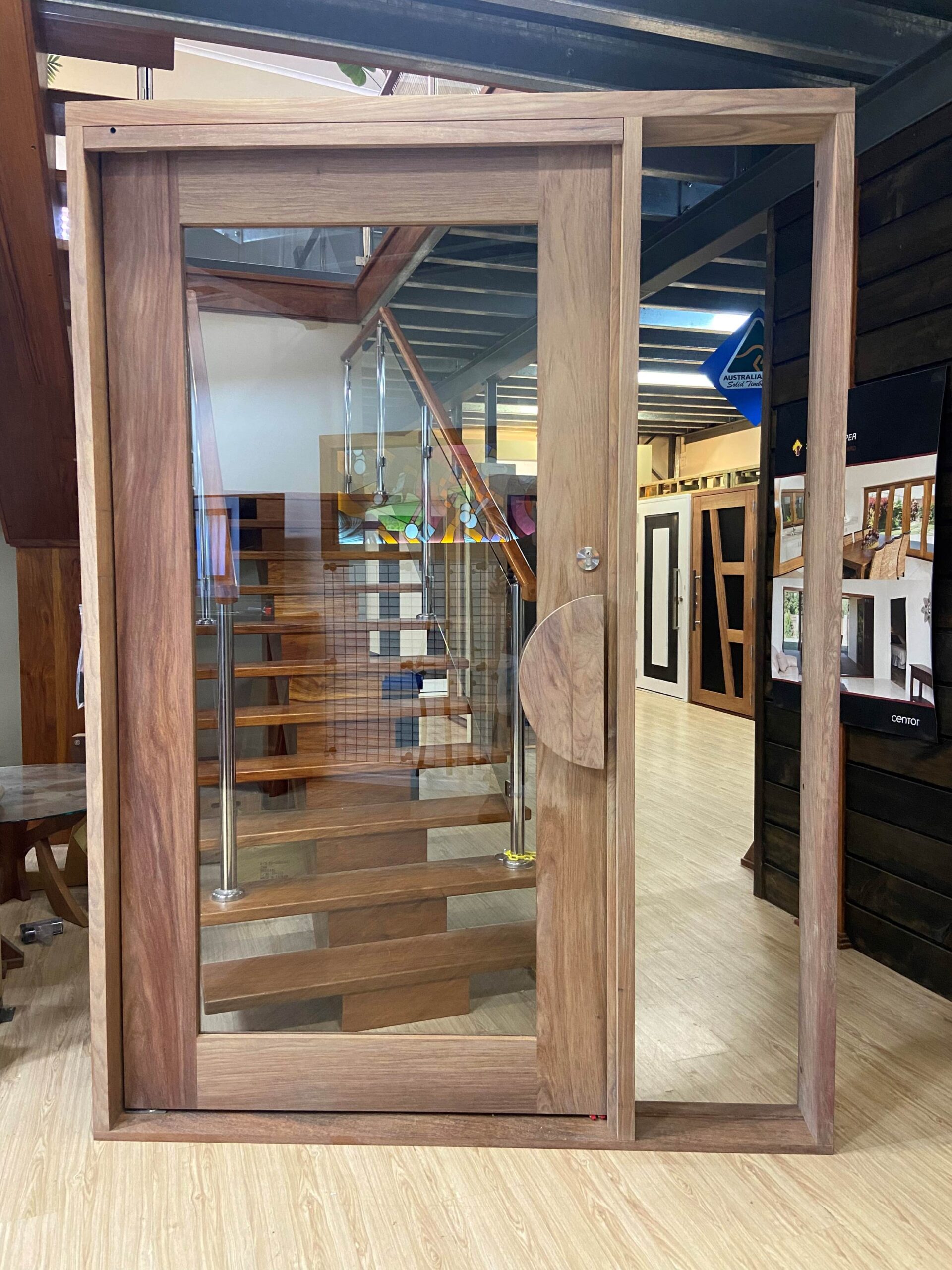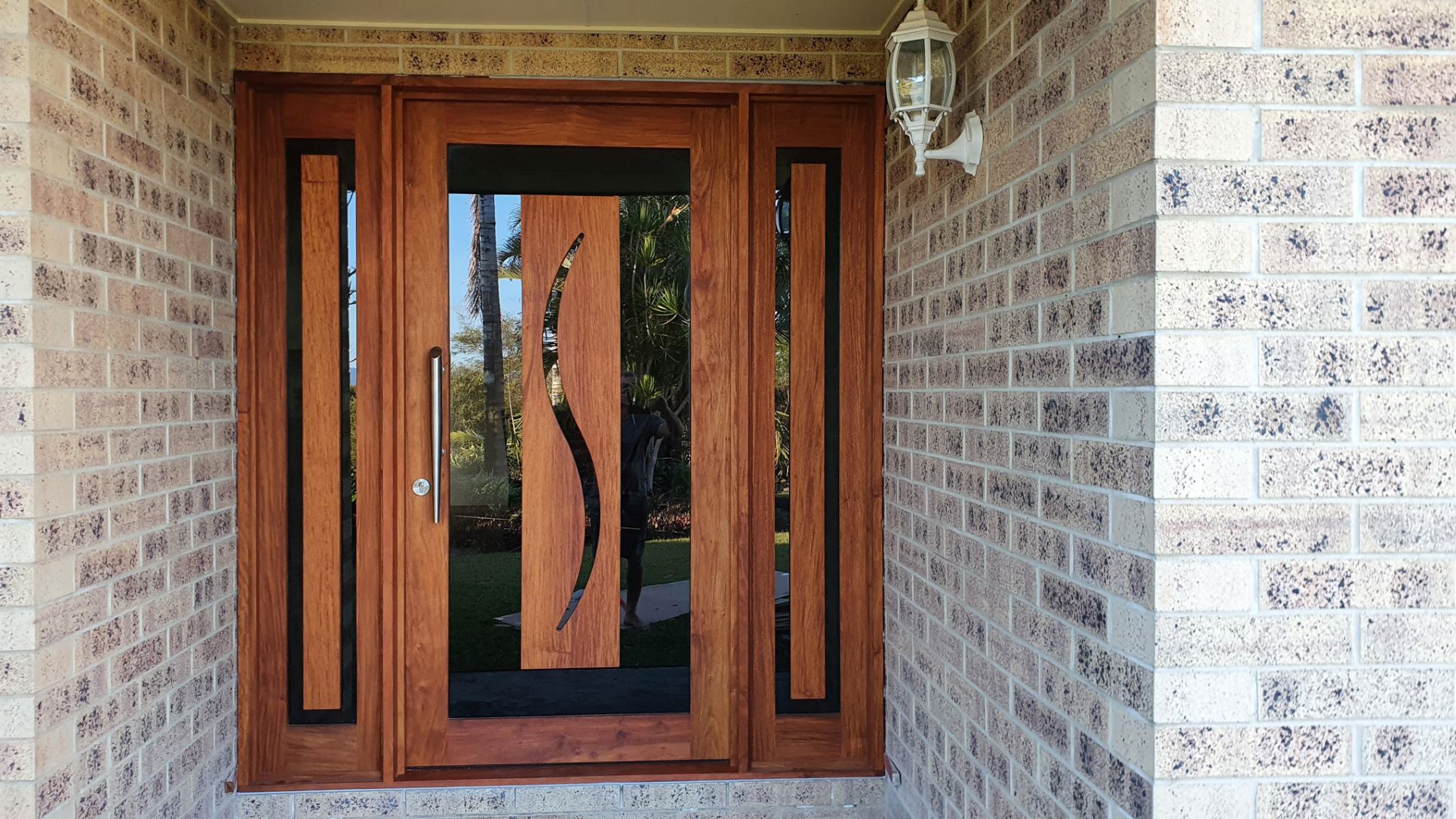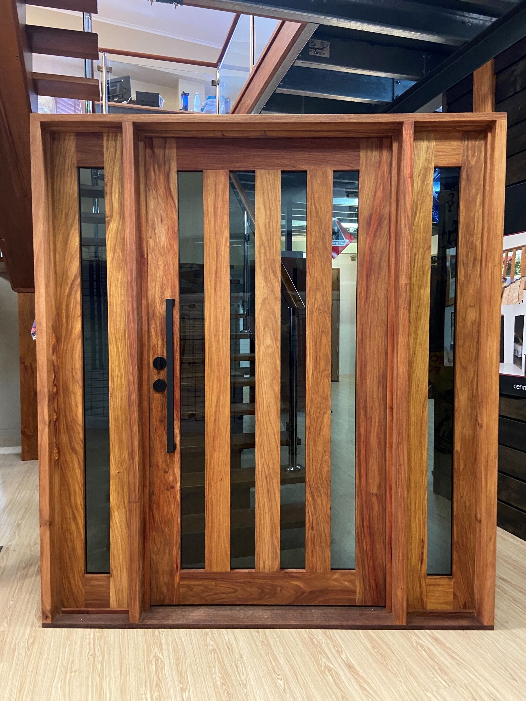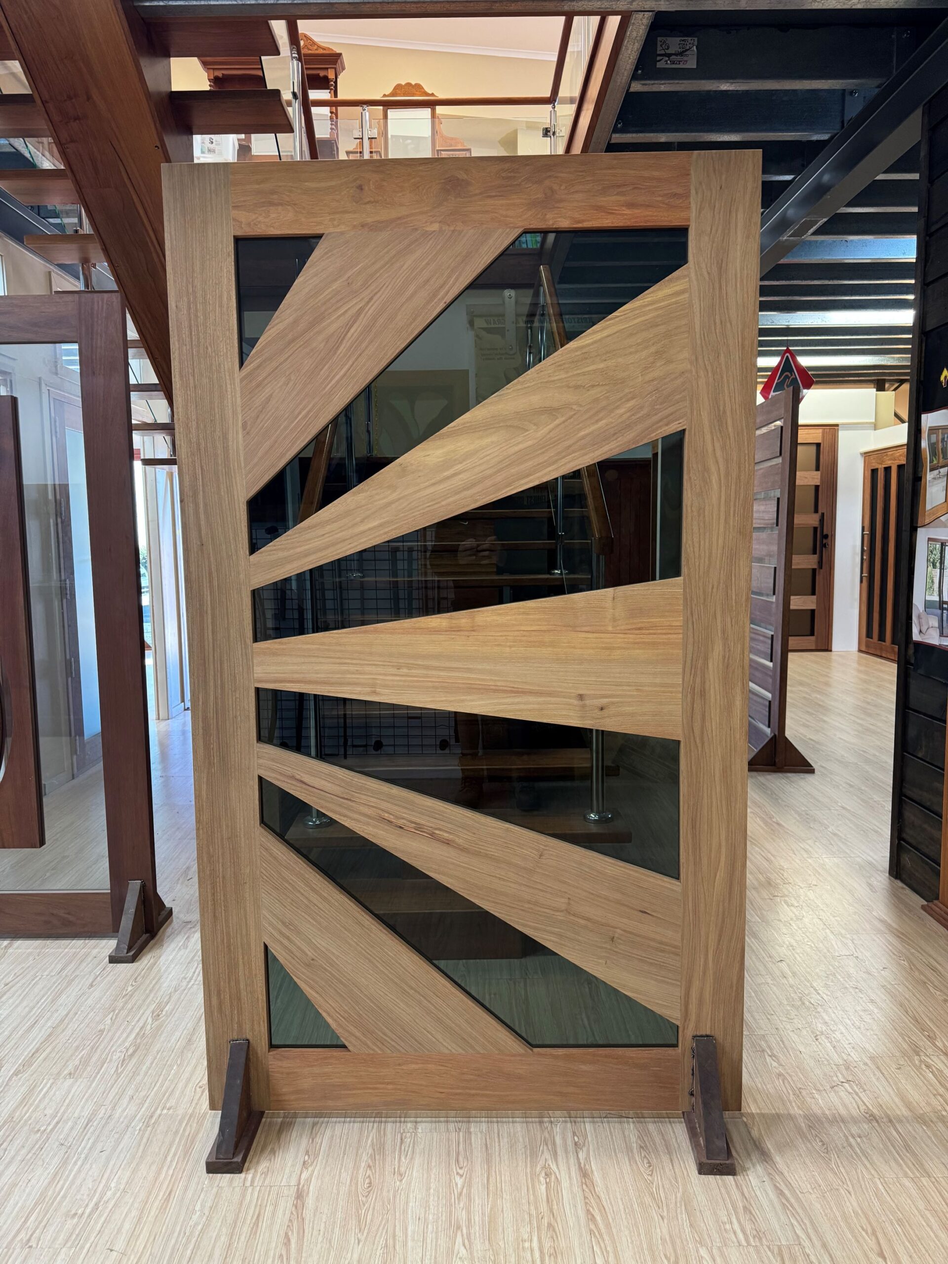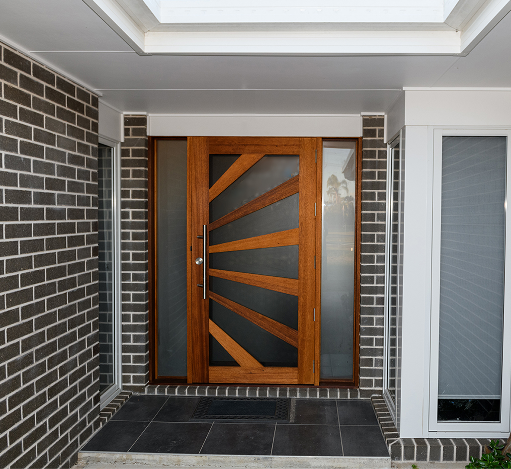A stunning entrance door to enhance your home. Its sunburst-inspired timber rails, separated by large glass panels, allow light to stream through.