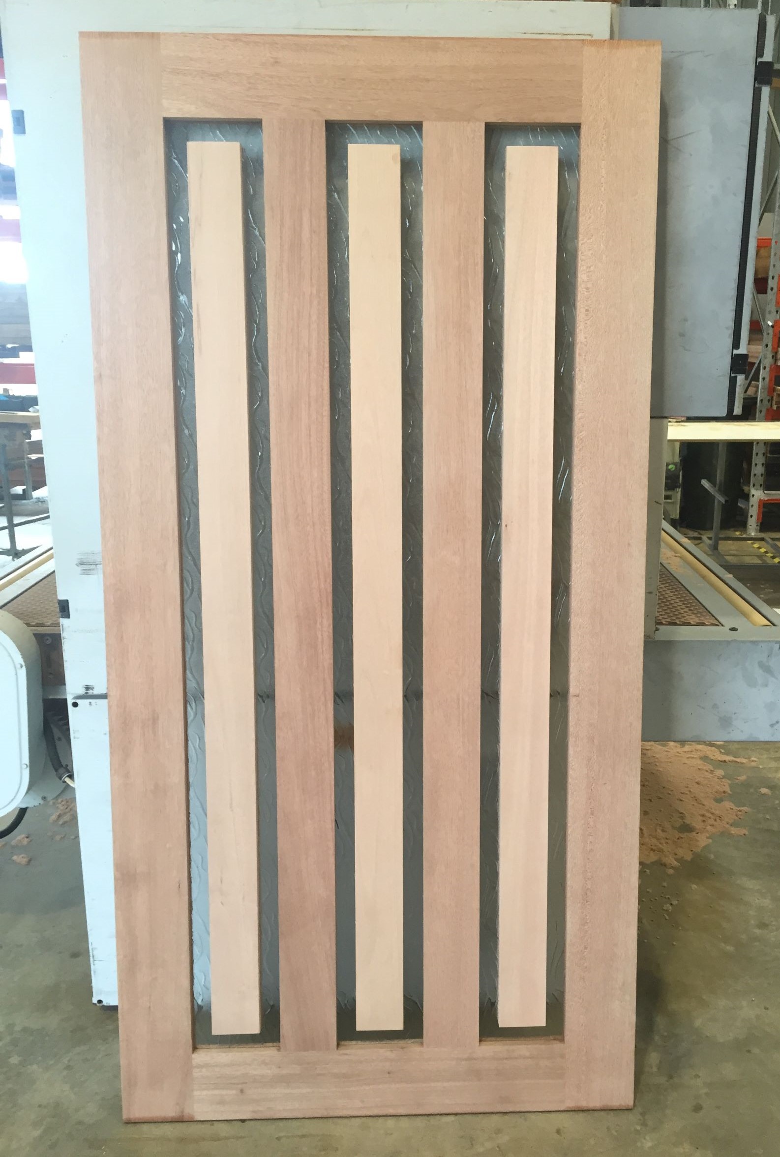 The vertical lines are a dominant part of this door’s attraction, offering considerable privacy yet still allowing light transfer, also available as a mirrored design
