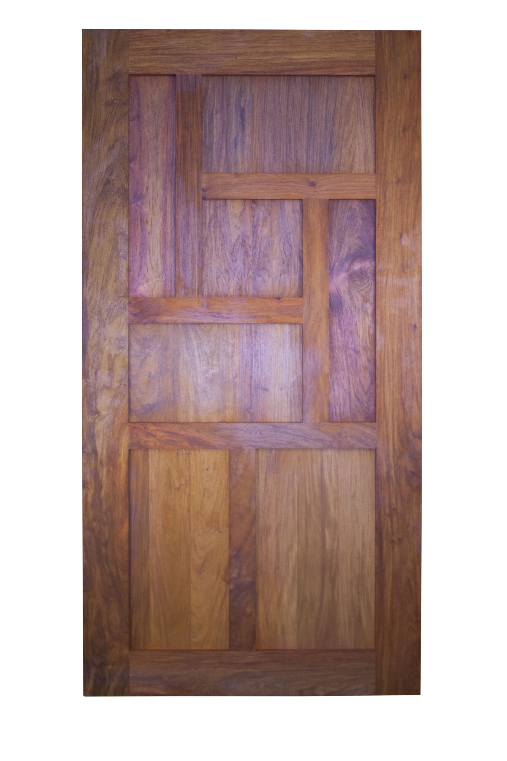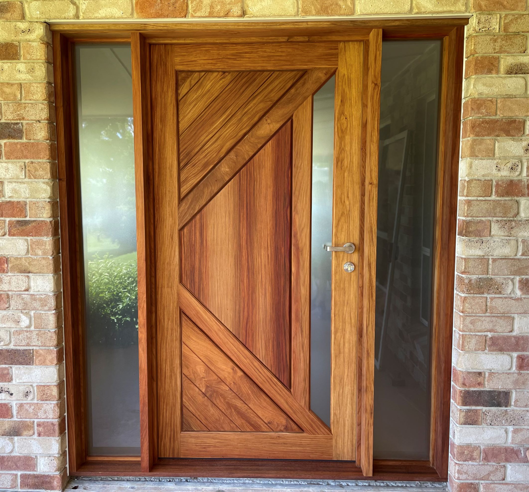 Looking for something different, yet still with a traditional feel? Narrow timber bars create an interesting, asymmetrical, geometric pattern on this attractive, full-timber door, which can also be manufactured with glazed panel in place of timber.